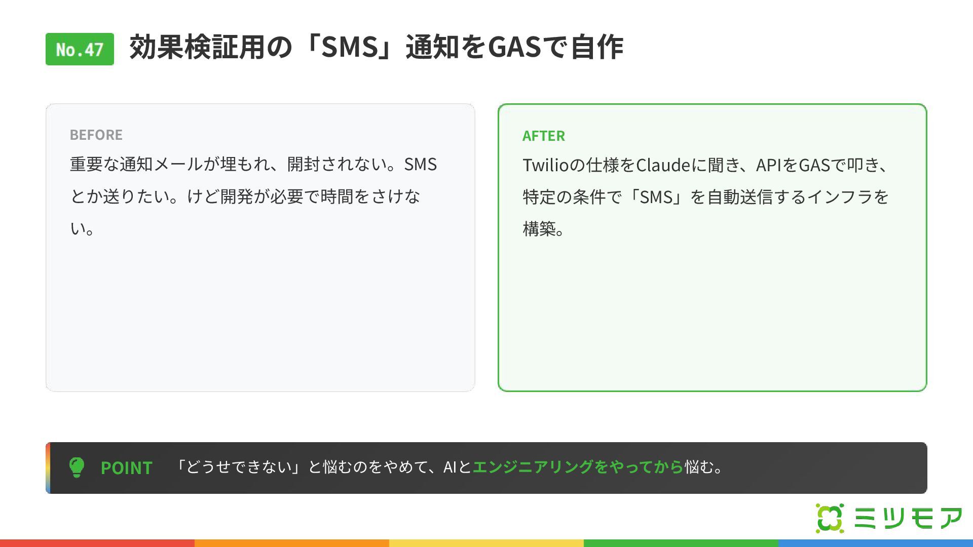 効果検証⽤の「SMS」通知をGASで⾃作 POINT 「どうせできない」と悩むのをやめて、AIとエンジニアリングをやってから悩む。 BEFORE 重要な通知メールが埋もれ、開封されない。SMS とか送りたい。けど開発が必要で時間をさけな い。 AFTER Twilioの仕様をClaudeに聞き、APIをGASで叩き、 特定の条件で「SMS」を⾃動送信するインフラを