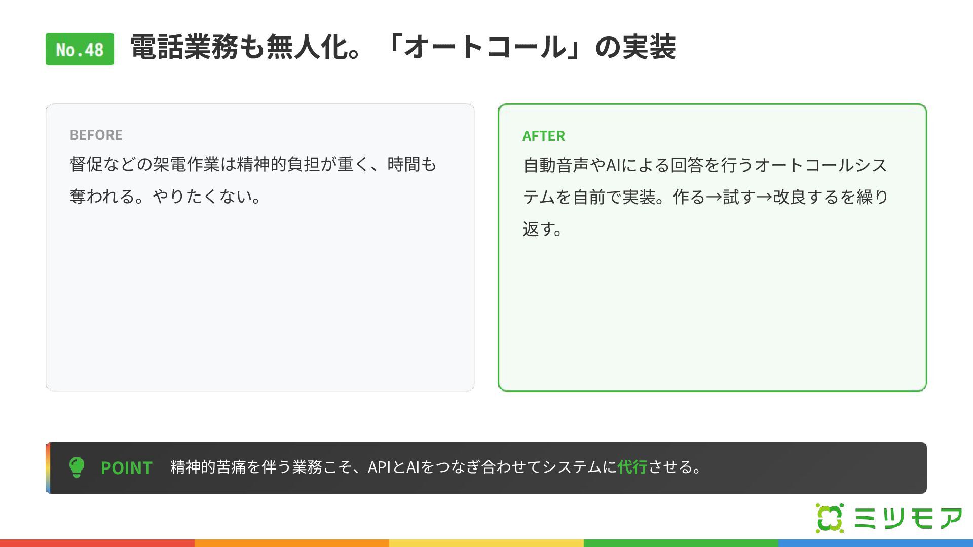 電話業務も無⼈化。「オートコール」の実装 POINT 精神的苦痛を伴う業務こそ、APIとAIをつなぎ合わせてシステムに代⾏させる。 BEFORE 督促などの架電作業は精神的負担が重く、時間も 奪われる。やりたくない。 AFTER ⾃動⾳声やAIによる回答を⾏うオートコールシス テムを⾃前で実装。作る→試す→改良するを繰り 返す。