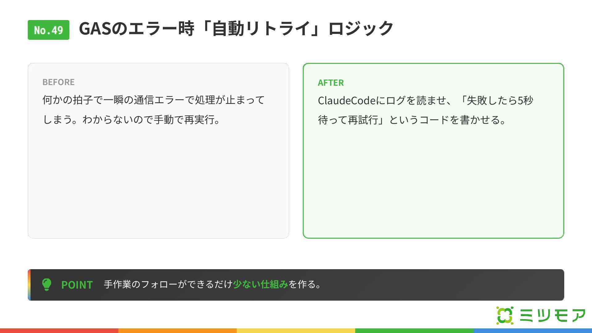 GASのエラー時「⾃動リトライ」ロジック POINT ⼿作業のフォローができるだけ少ない仕組みを作る。 BEFORE 何かの拍⼦で⼀瞬の通信エラーで処理が⽌まって しまう。わからないので⼿動で再実⾏。 AFTER ClaudeCodeにログを読ませ、「失敗したら5秒 待って再試⾏」というコードを書かせる。
