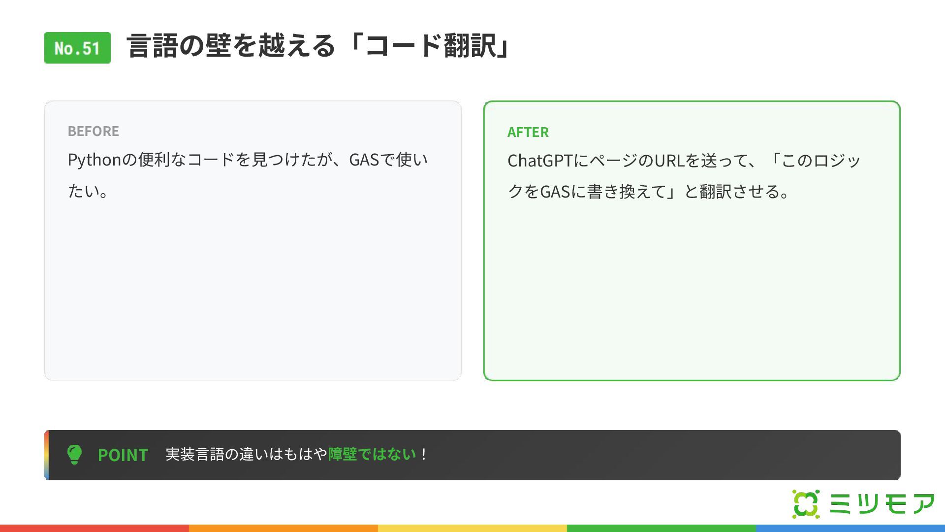⾔語の壁を越える「コード翻訳」 POINT 実装⾔語の違いはもはや障壁ではない! BEFORE Pythonの便利なコードを⾒つけたが、GASで使い たい。 AFTER ChatGPTにページのURLを送って、「このロジッ クをGASに書き換えて」と翻訳させる。