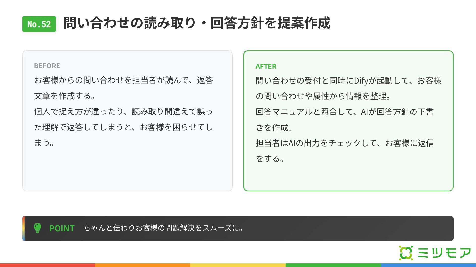 問い合わせの読み取り‧回答⽅針を提案作成 POINT ちゃんと伝わりお客様の問題解決をスムーズに。 BEFORE お客様からの問い合わせを担当者が読んで、返答 ⽂章を作成する。 個⼈で捉え⽅が違ったり、読み取り間違えて誤っ た理解で返答してしまうと、お客様を困らせてし まう。 AFTER