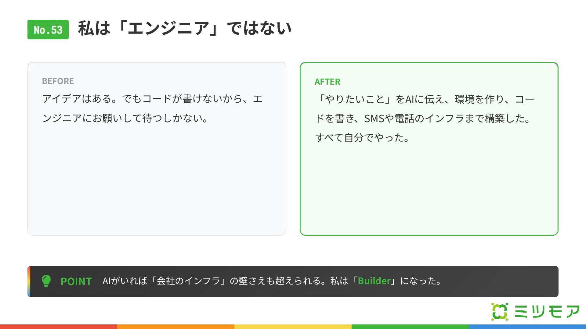 私は「エンジニア」ではない POINT AIがいれば「会社のインフラ」の壁さえも超えられる。私は「Builder」になった。 BEFORE アイデアはある。でもコードが書けないから、エ ンジニアにお願いして待つしかない。 AFTER 「やりたいこと」をAIに伝え、環境を作り、コー ドを書き、SMSや電話のインフラまで構築した。 すべて⾃分でやった。