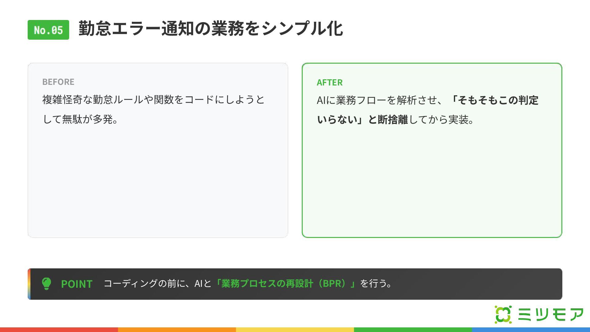 勤怠エラー通知の業務をシンプル化 POINT コーディングの前に、AIと「業務プロセスの再設計(BPR)」を⾏う。 BEFORE 複雑怪奇な勤怠ルールや関数をコードにしようと して無駄が多発。 AFTER AIに業務フローを解析させ、「そもそもこの判定 いらない」と断捨離してから実装。
