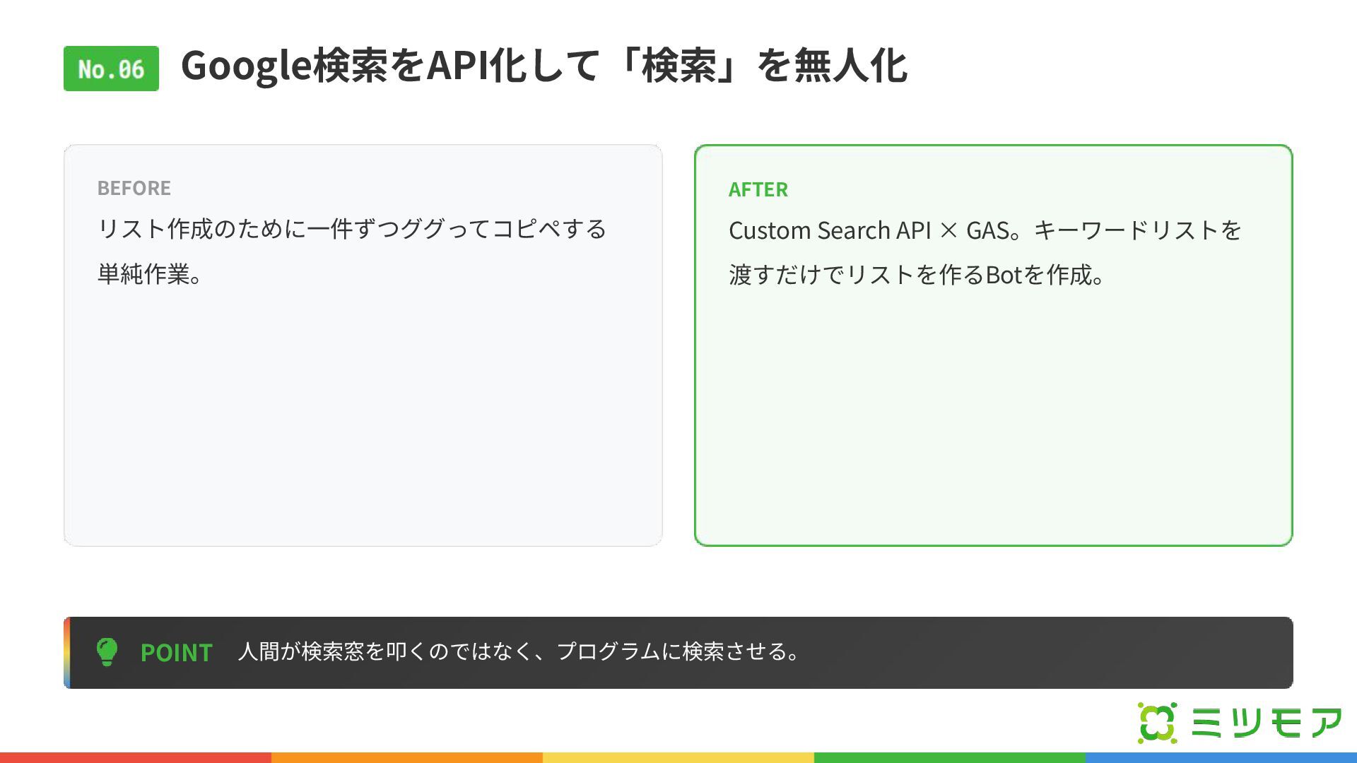 Google検索をAPI化して「検索」を無⼈化 POINT ⼈間が検索窓を叩くのではなく、プログラムに検索させる。 BEFORE リスト作成のために⼀件ずつググってコピペする 単純作業。 AFTER Custom Search API
