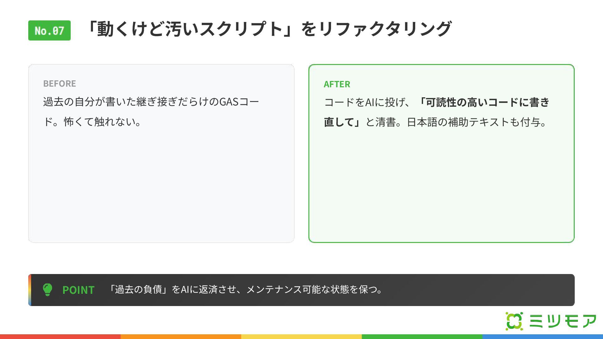 「動くけど汚いスクリプト」をリファクタリング POINT 「過去の負債」をAIに返済させ、メンテナンス可能な状態を保つ。 BEFORE 過去の⾃分が書いた継ぎ接ぎだらけのGASコー ド。怖くて触れない。 AFTER コードをAIに投げ、「可読性の⾼いコードに書き 直して」と清書。⽇本語の補助テキストも付与。