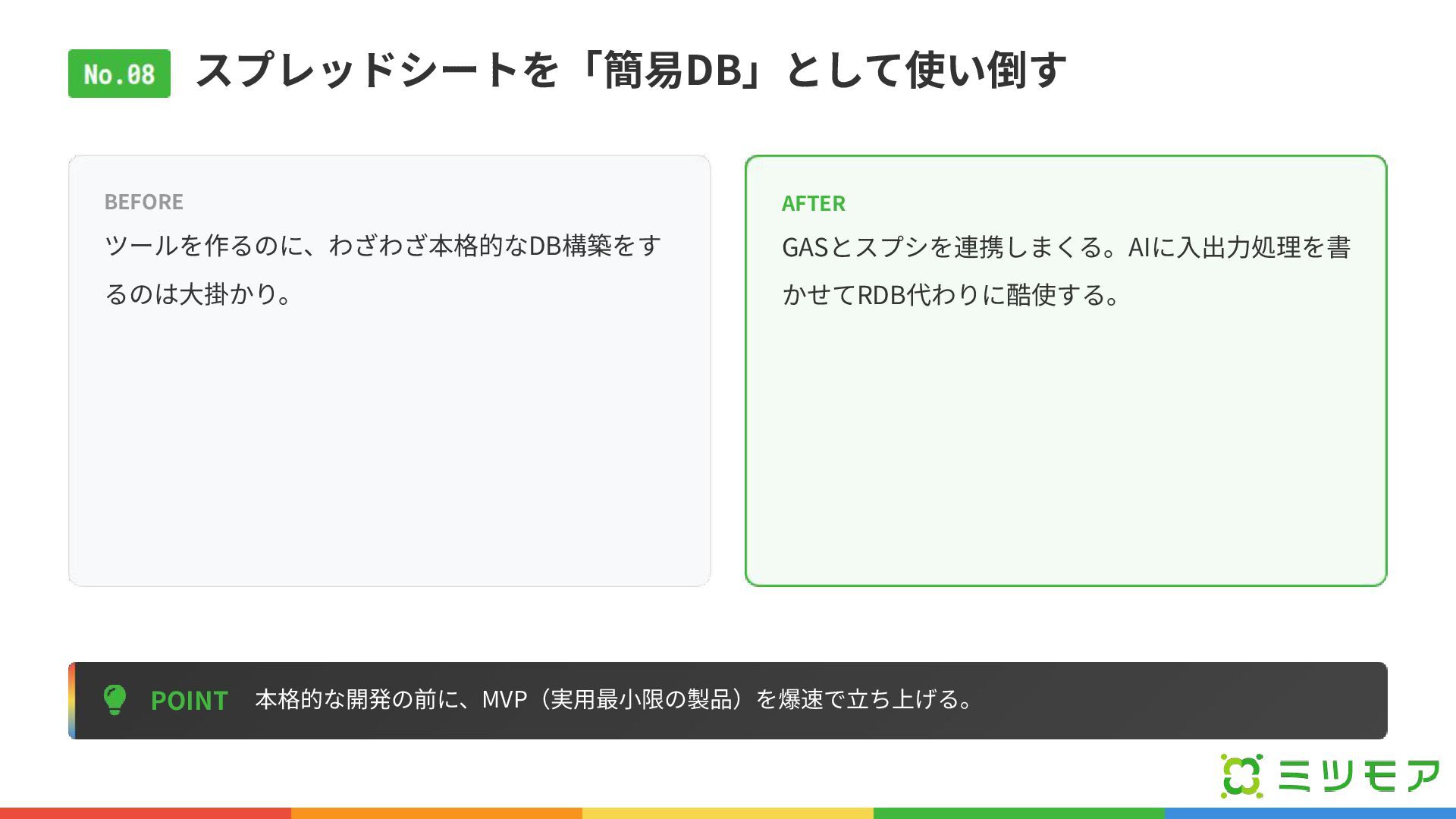 スプレッドシートを「簡易DB」として使い倒す POINT 本格的な開発の前に、MVP(実⽤最⼩限の製品)を爆速で⽴ち上げる。 BEFORE ツールを作るのに、わざわざ本格的なDB構築をす るのは⼤掛かり。 AFTER GASとスプシを連携しまくる。AIに⼊出⼒処理を書 かせてRDB代わりに酷使する。