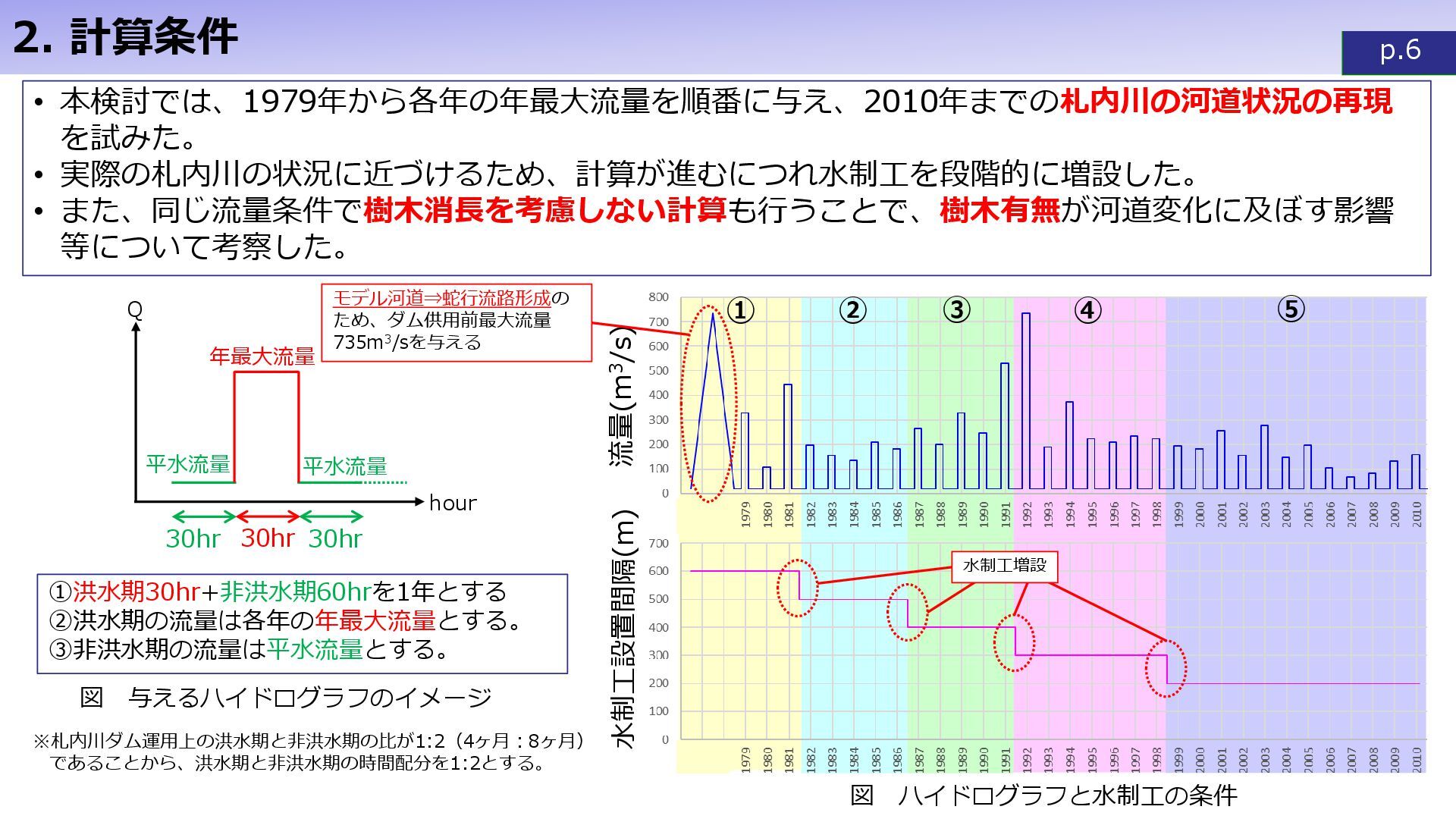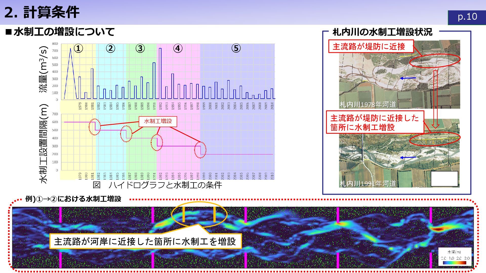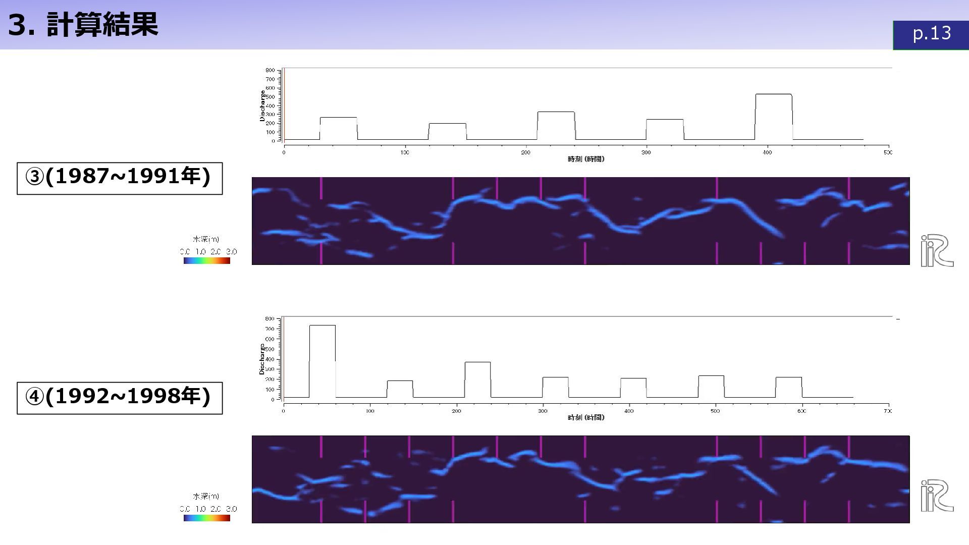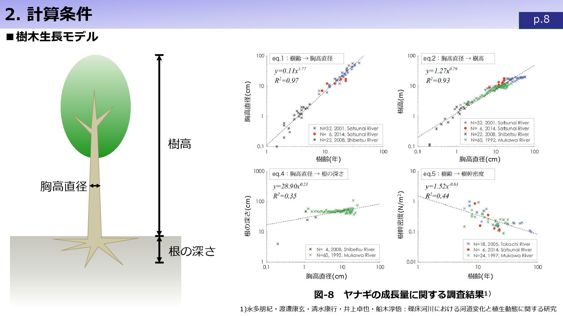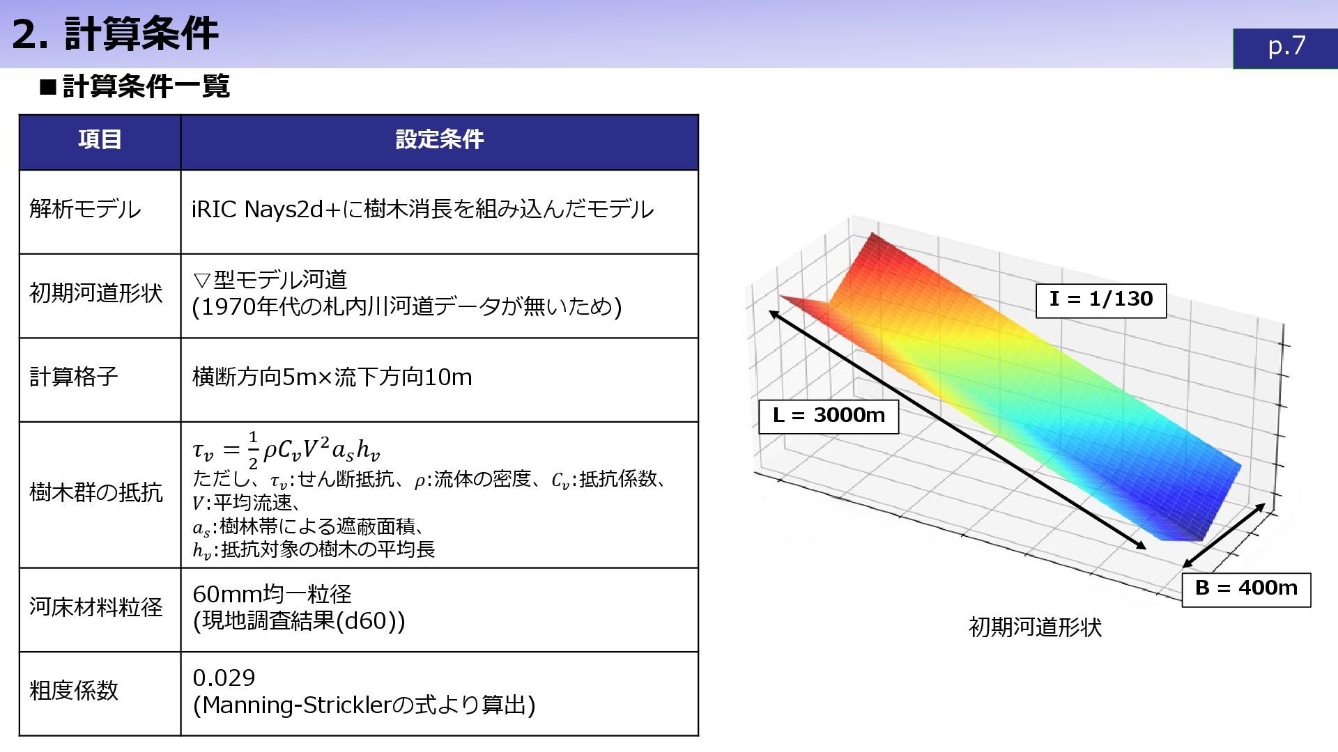 ▪計算条件一覧 項目 設定条件 解析モデル iRIC Nays2d+に樹木消長を組み込んだモデル 初期河道形状 ▽型モデル河道 (1970年代の札内川河道データが無いため) 計算格子 横断方向5m×流下方向10m 樹木群の抵抗 𝜏𝜏𝑣𝑣 = 1 2 𝜌𝜌𝐶𝐶𝑣𝑣 𝑉𝑉2𝑎𝑎𝑠𝑠 ℎ𝑣𝑣 ただし、𝜏𝜏𝑣𝑣 :せん断抵抗、𝜌𝜌:流体の密度、𝐶𝐶𝑣𝑣 :抵抗係数、 𝑉𝑉:平均流速、 𝑎𝑎𝑠𝑠 :樹林帯による遮蔽面積、 ℎ𝑣𝑣 :抵抗対象の樹木の平均長 河床材料粒径 60mm均一粒径 (現地調査結果(d60)) 粗度係数 0.029 (Manning-Stricklerの式より算出) 初期河道形状 2. 計算条件