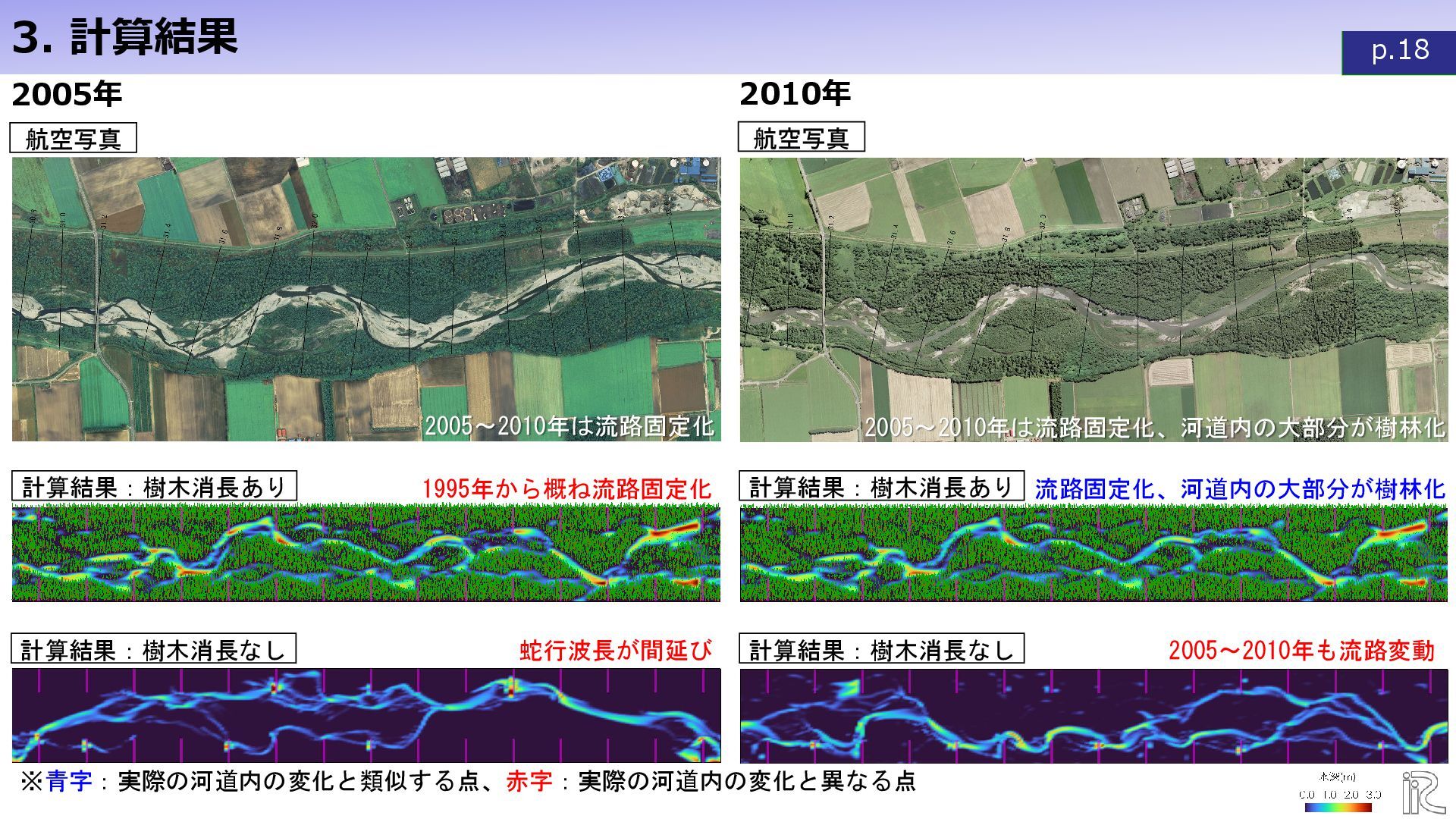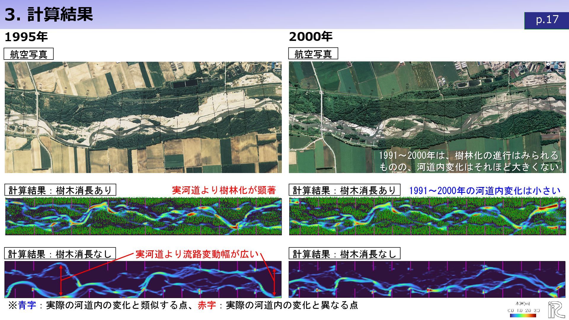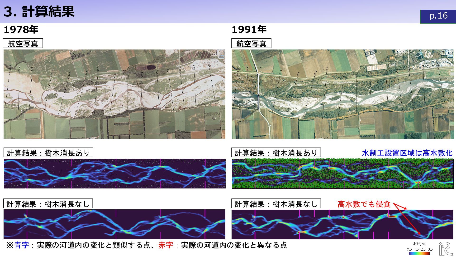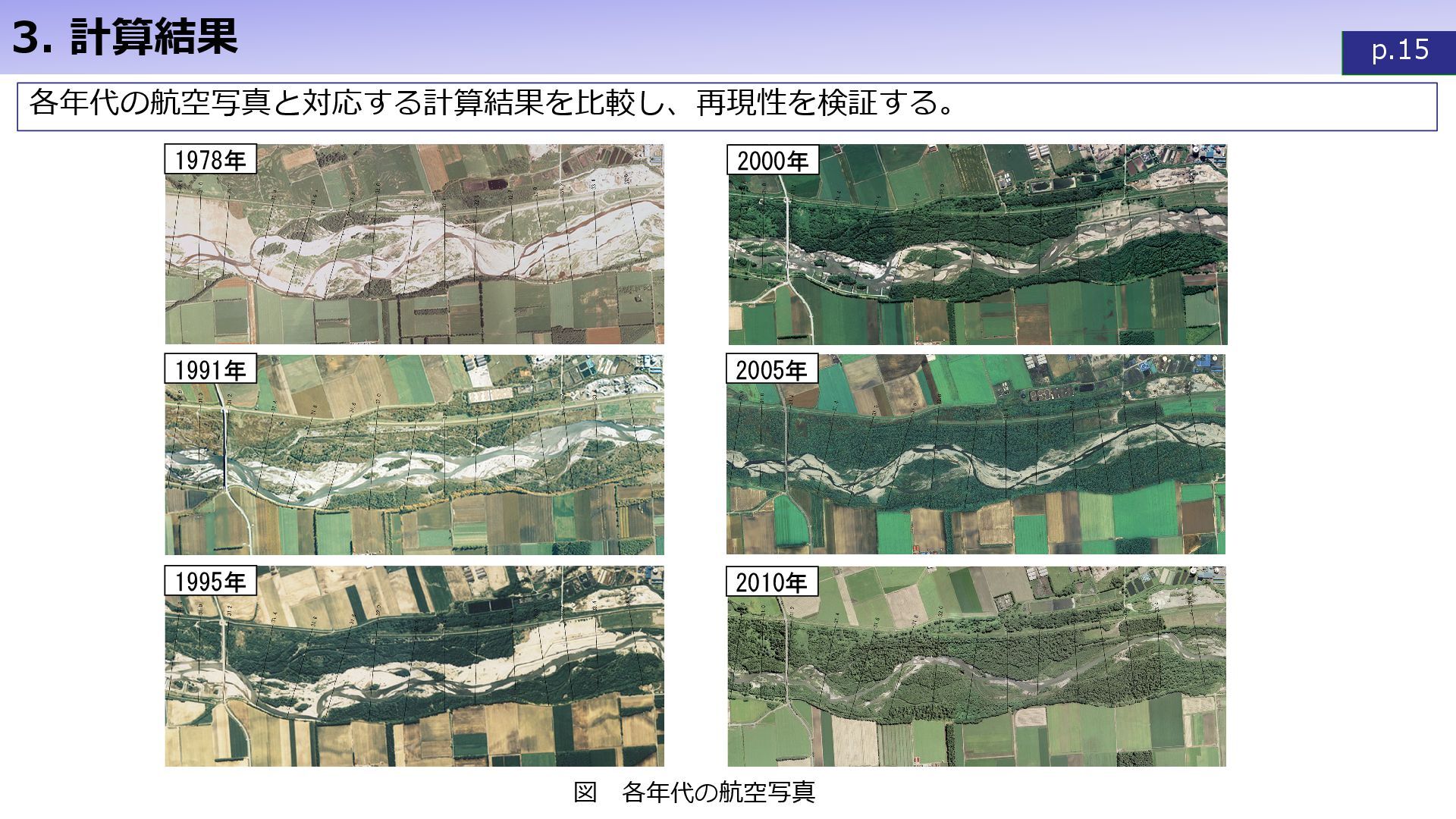 ▪計算条件一覧 項目 設定条件 解析モデル iRIC Nays2d+に樹木消長を組み込んだモデル 初期河道形状 ▽型モデル河道 (1970年代の札内川河道データが無いため) 計算格子 横断方向5m×流下方向10m 樹木群の抵抗 𝜏𝜏𝑣𝑣 = 1 2 𝜌𝜌𝐶𝐶𝑣𝑣 𝑉𝑉2𝑎𝑎𝑠𝑠 ℎ𝑣𝑣 ただし、𝜏𝜏𝑣𝑣 :せん断抵抗、𝜌𝜌:流体の密度、𝐶𝐶𝑣𝑣 :抵抗係数、 𝑉𝑉:平均流速、 𝑎𝑎𝑠𝑠 :樹林帯による遮蔽面積、 ℎ𝑣𝑣 :抵抗対象の樹木の平均長 河床材料粒径 60mm均一粒径 (現地調査結果(d60)) 粗度係数 0.029 (Manning-Stricklerの式より算出) 初期河道形状 2. 計算条件
