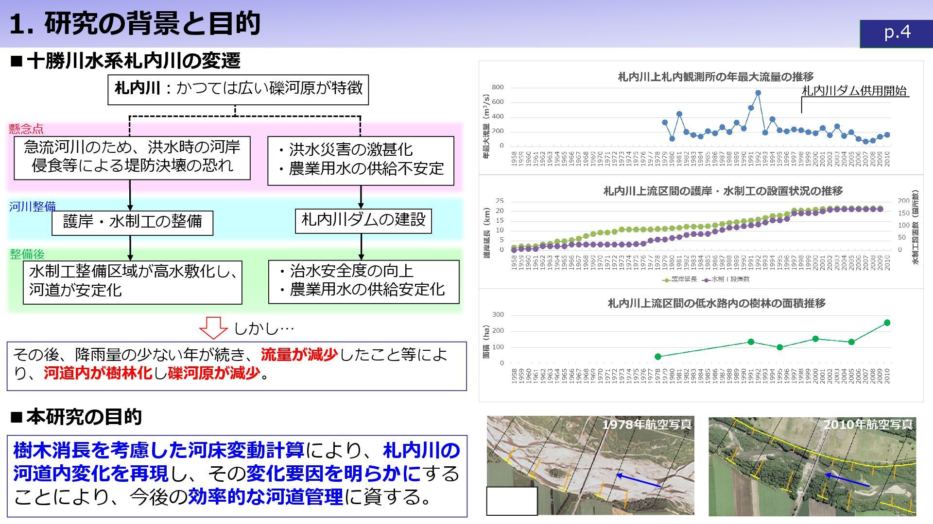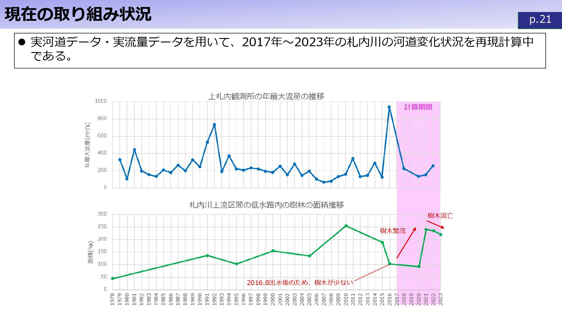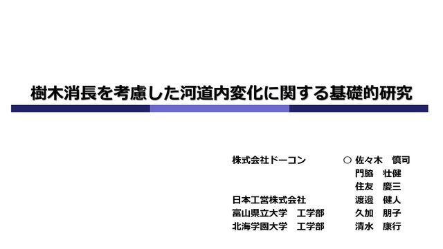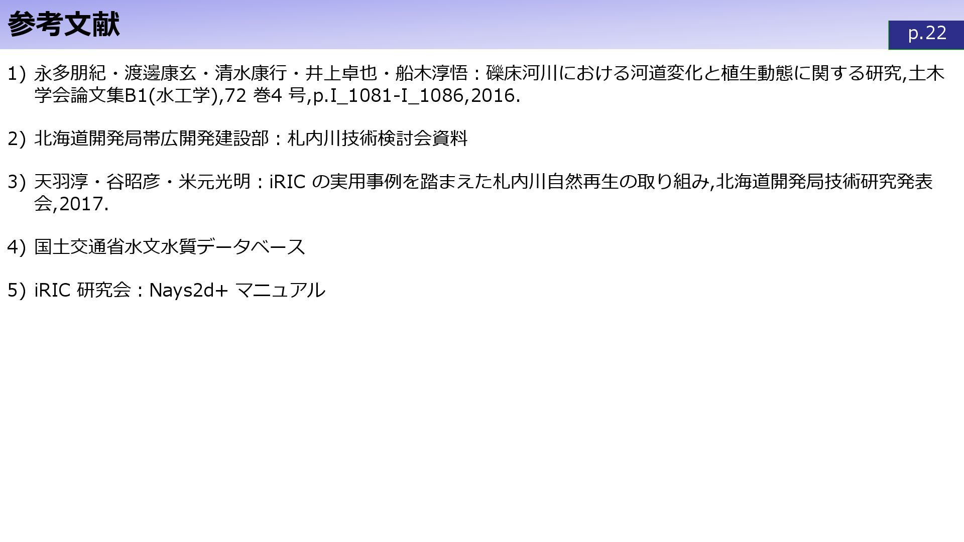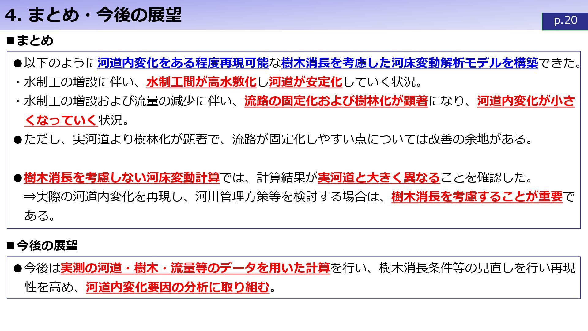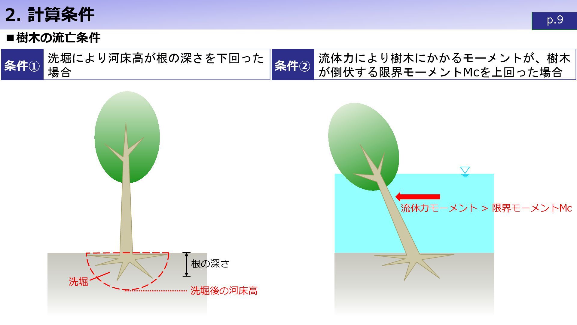▪計算条件一覧 項目 設定条件 解析モデル iRIC Nays2d+に樹木消長を組み込んだモデル 初期河道形状 ▽型モデル河道 (1970年代の札内川河道データが無いため) 計算格子 横断方向5m×流下方向10m 樹木群の抵抗 𝜏𝜏𝑣𝑣 = 1 2 𝜌𝜌𝐶𝐶𝑣𝑣 𝑉𝑉2𝑎𝑎𝑠𝑠 ℎ𝑣𝑣 ただし、𝜏𝜏𝑣𝑣 :せん断抵抗、𝜌𝜌:流体の密度、𝐶𝐶𝑣𝑣 :抵抗係数、 𝑉𝑉:平均流速、 𝑎𝑎𝑠𝑠 :樹林帯による遮蔽面積、 ℎ𝑣𝑣 :抵抗対象の樹木の平均長 河床材料粒径 60mm均一粒径 (現地調査結果(d60)) 粗度係数 0.029 (Manning-Stricklerの式より算出) 初期河道形状 2. 計算条件