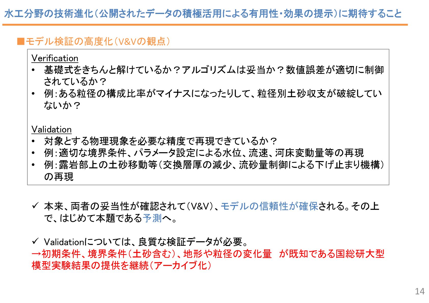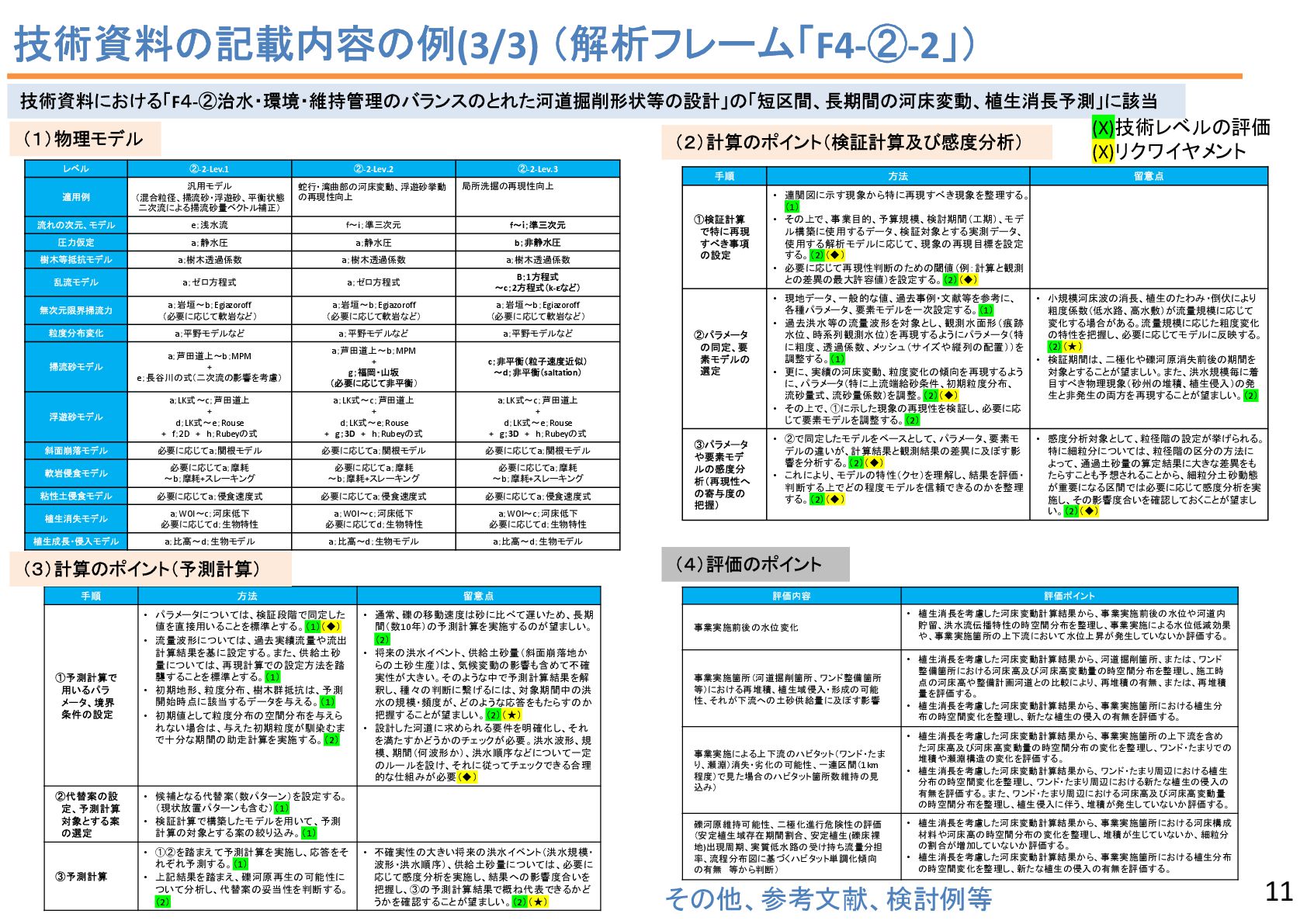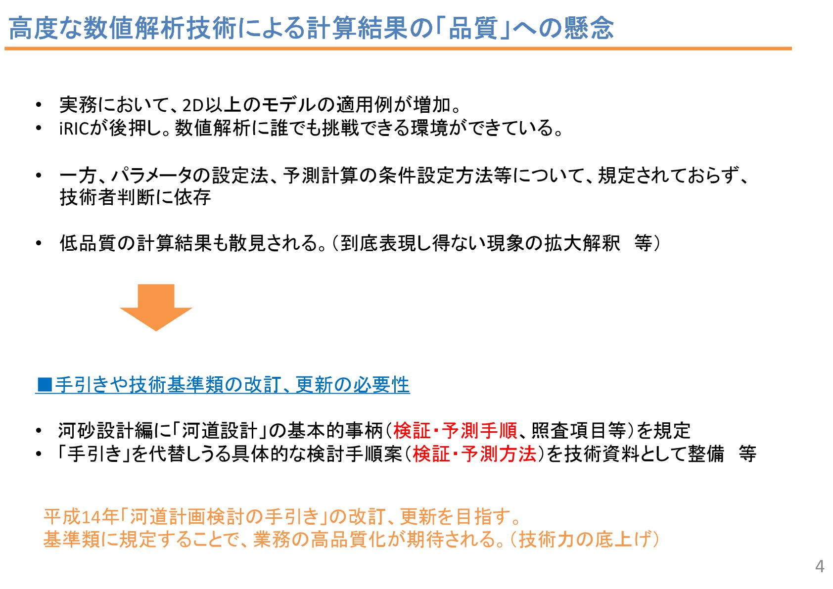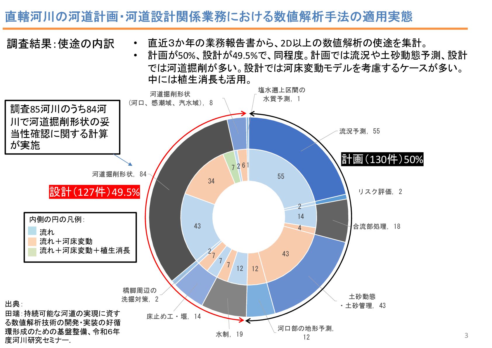 2 43 34 7 2 6 1 流況予測, 55 リスク評価, 2 合流部処理, 18 土砂動態 ・土砂管理, 43 河口部の地形予測 , 12 水制, 19 床止め工・堰, 14 橋脚周辺の 洗掘対策 , 2 河道掘削形状, 84 河道掘削形状 (河口、感潮域、汽水域), 8 塩水遡上区間の 水質予測, 1 3 • 直近3か年の業務報告書から、2D以上の数値解析の使途を集計。 • 計画が50%、設計が49.5%で、同程度。計画では流況や土砂動態予測、設計 では河道掘削が多い。設計では河床変動モデルを考慮するケースが多い。 中には植生消長も活用。 調査結果:使途の内訳 計画(130件)50% 設計(127件)49.5% 内側の円の凡例: 流れ 流れ+河床変動 流れ+河床変動+植生消長 調査85河川のうち84河 川で河道掘削形状の妥 当性確認に関する計算 が実施 直轄河川の河道計画・河道設計関係業務における数値解析手法の適用実態 出典: 田端:持続可能な河道の実現に資す る数値解析技術の開発・実装の好循 環形成のための基盤整備、令和6年 度河川研究セミナー.