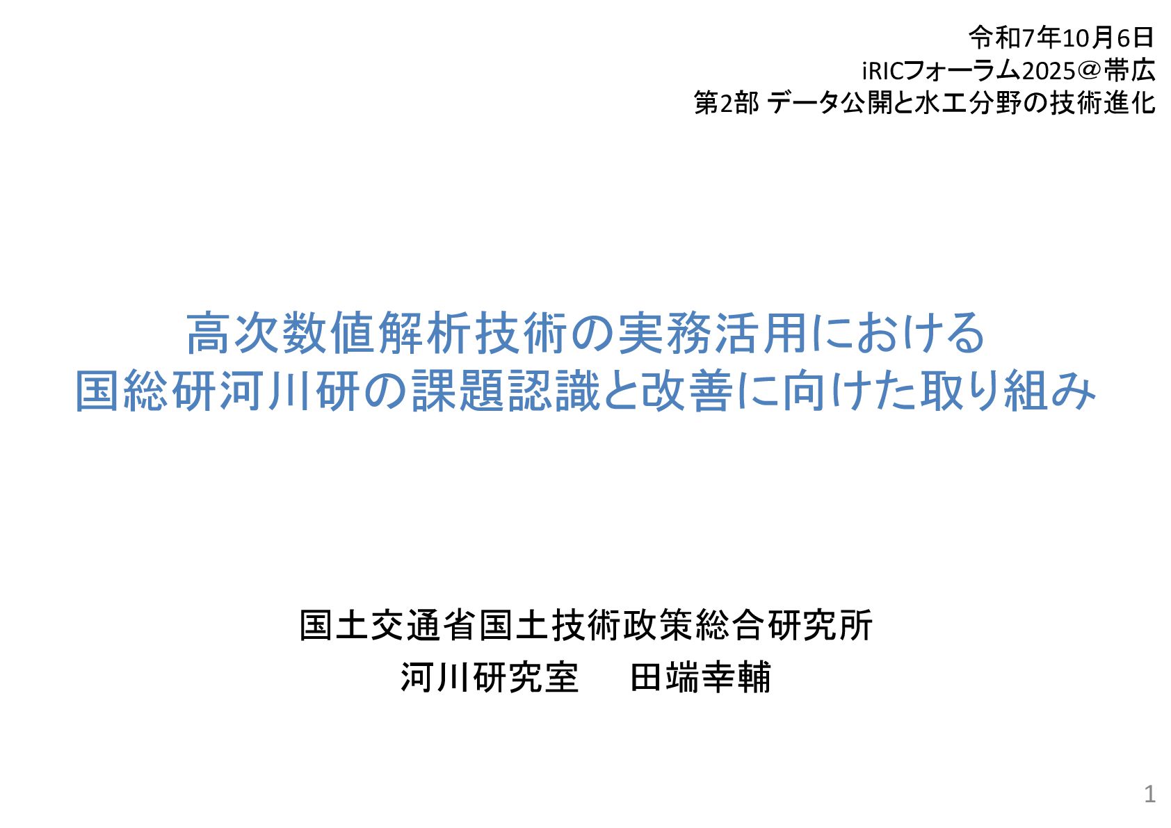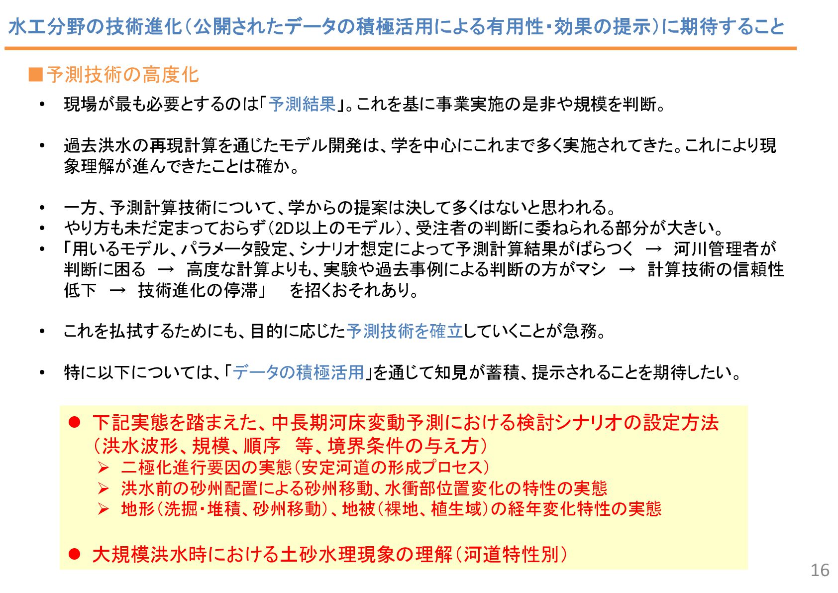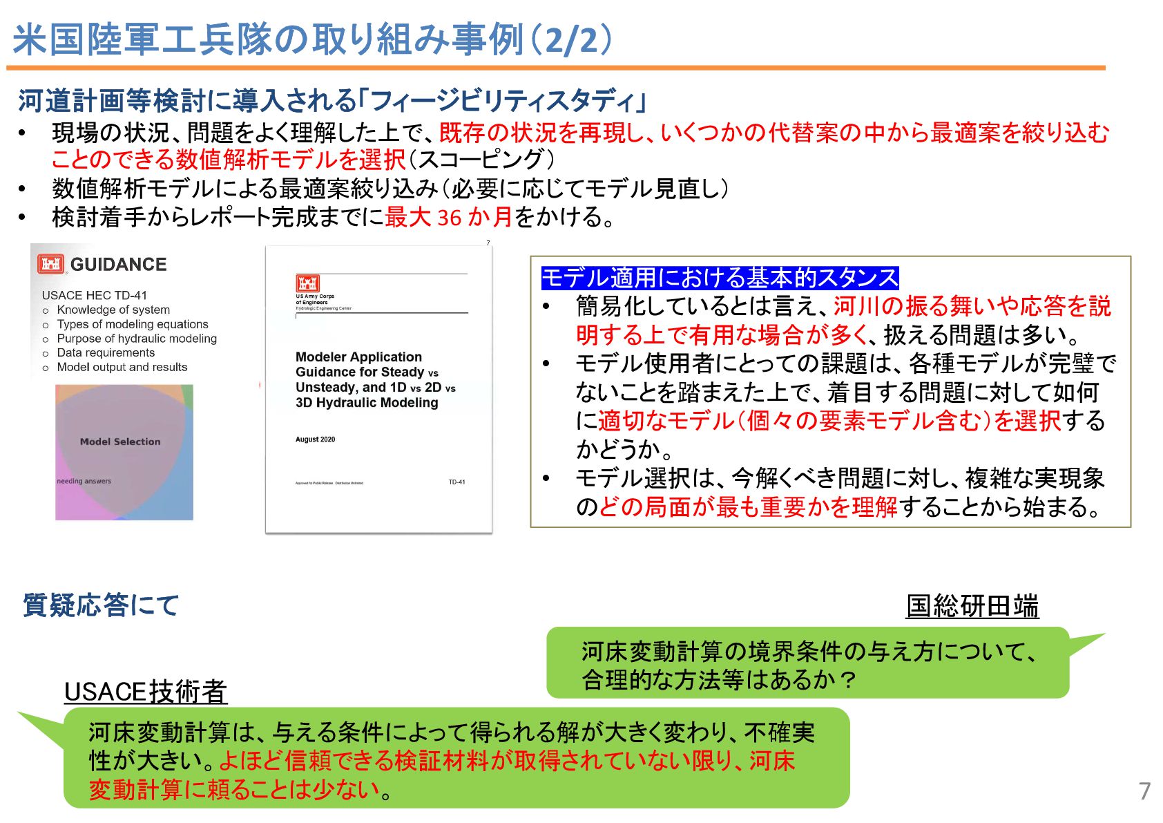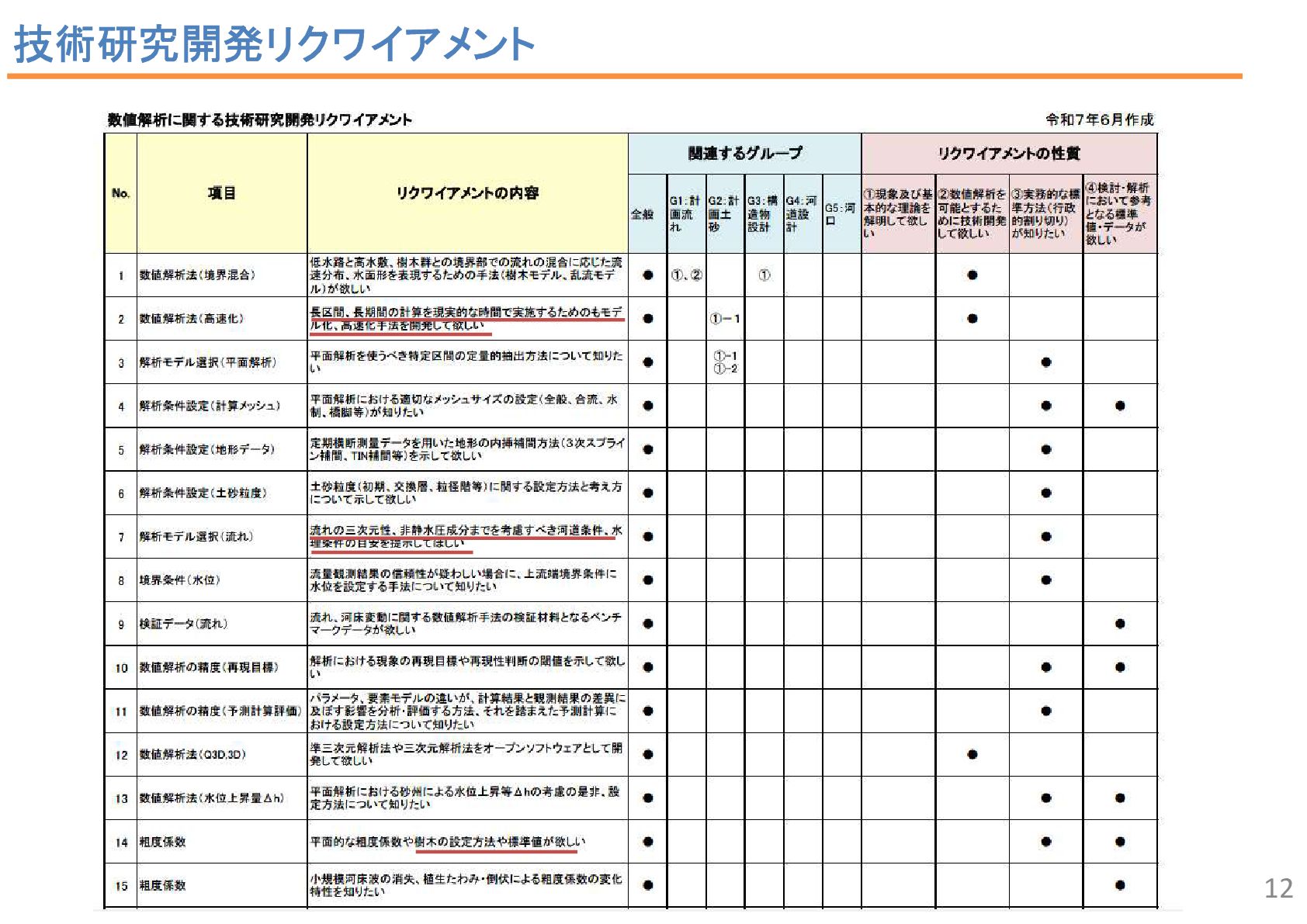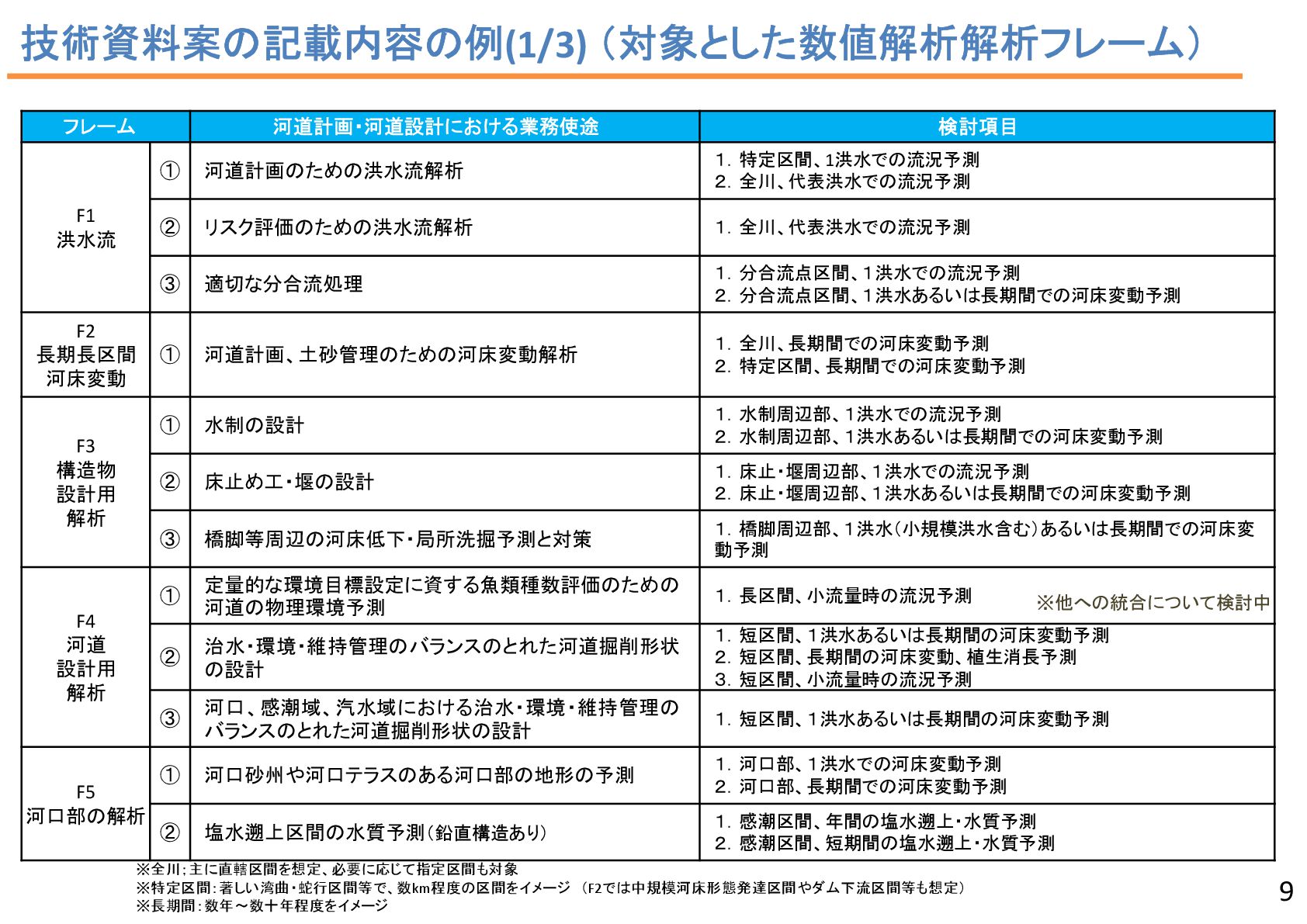 2 43 34 7 2 6 1 流況予測, 55 リスク評価, 2 合流部処理, 18 土砂動態 ・土砂管理, 43 河口部の地形予測 , 12 水制, 19 床止め工・堰, 14 橋脚周辺の 洗掘対策 , 2 河道掘削形状, 84 河道掘削形状 (河口、感潮域、汽水域), 8 塩水遡上区間の 水質予測, 1 3 • 直近3か年の業務報告書から、2D以上の数値解析の使途を集計。 • 計画が50%、設計が49.5%で、同程度。計画では流況や土砂動態予測、設計 では河道掘削が多い。設計では河床変動モデルを考慮するケースが多い。 中には植生消長も活用。 調査結果:使途の内訳 計画(130件)50% 設計(127件)49.5% 内側の円の凡例: 流れ 流れ+河床変動 流れ+河床変動+植生消長 調査85河川のうち84河 川で河道掘削形状の妥 当性確認に関する計算 が実施 直轄河川の河道計画・河道設計関係業務における数値解析手法の適用実態 出典: 田端:持続可能な河道の実現に資す る数値解析技術の開発・実装の好循 環形成のための基盤整備、令和6年 度河川研究セミナー.