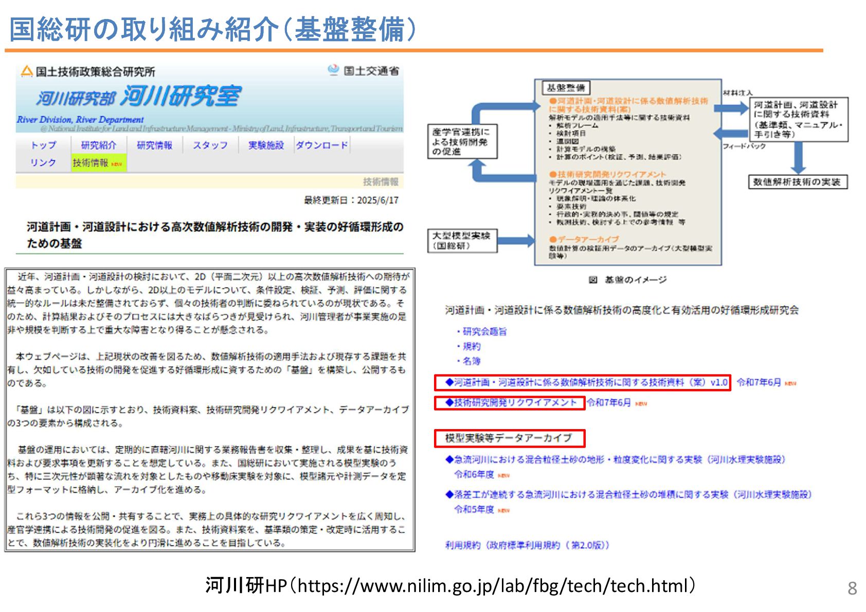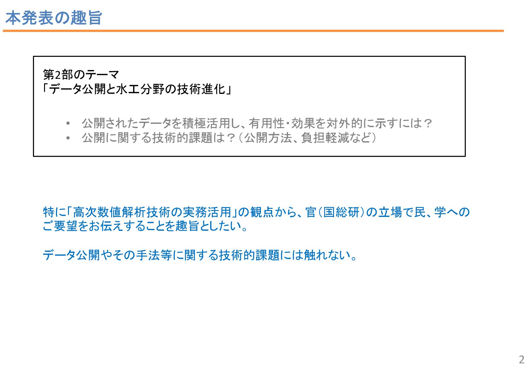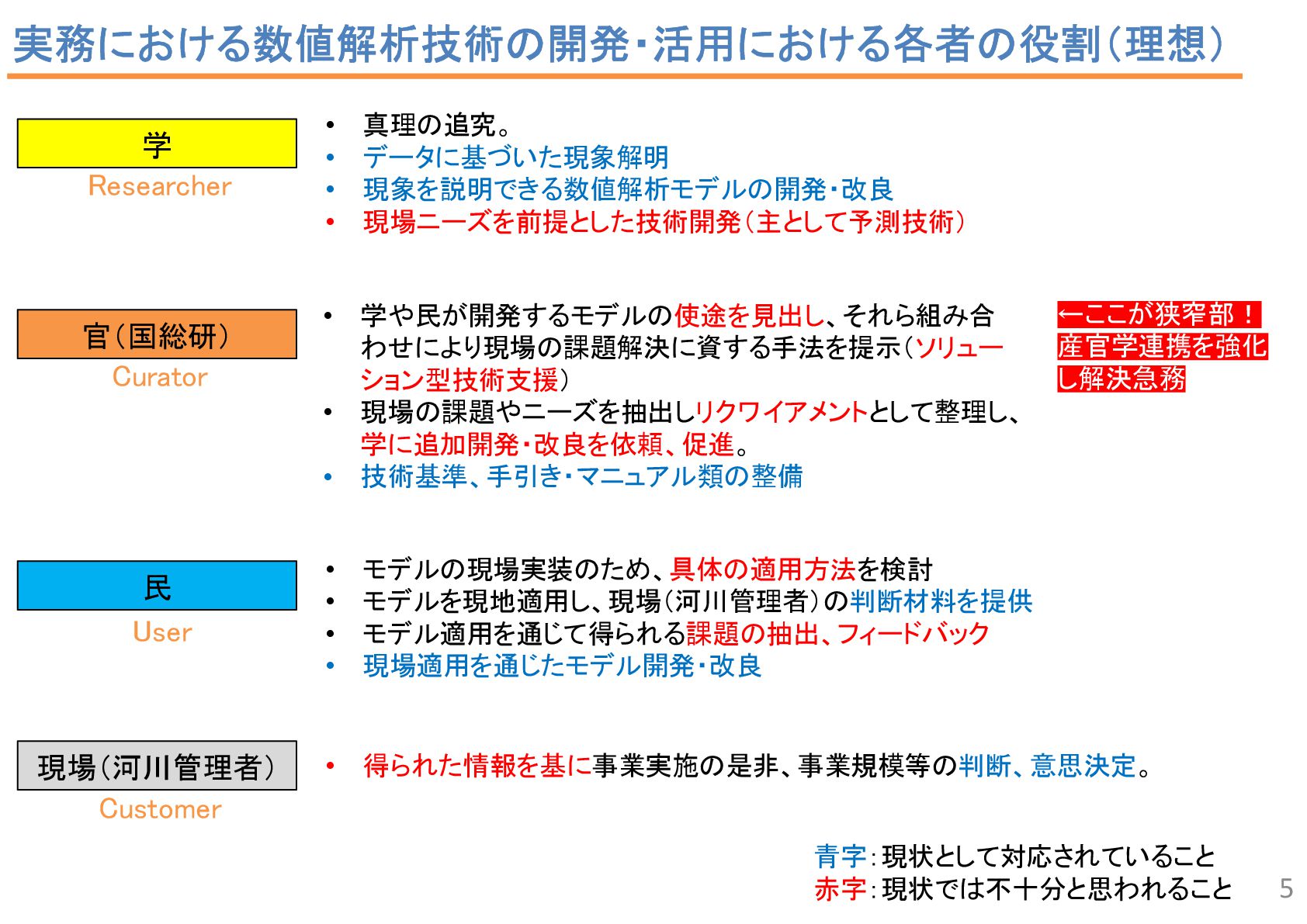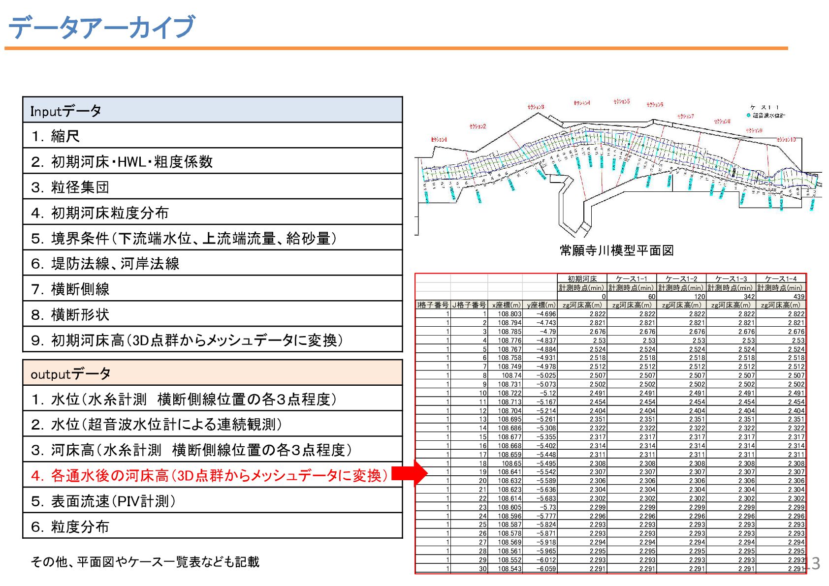 2 43 34 7 2 6 1 流況予測, 55 リスク評価, 2 合流部処理, 18 土砂動態 ・土砂管理, 43 河口部の地形予測 , 12 水制, 19 床止め工・堰, 14 橋脚周辺の 洗掘対策 , 2 河道掘削形状, 84 河道掘削形状 (河口、感潮域、汽水域), 8 塩水遡上区間の 水質予測, 1 3 • 直近3か年の業務報告書から、2D以上の数値解析の使途を集計。 • 計画が50%、設計が49.5%で、同程度。計画では流況や土砂動態予測、設計 では河道掘削が多い。設計では河床変動モデルを考慮するケースが多い。 中には植生消長も活用。 調査結果:使途の内訳 計画(130件)50% 設計(127件)49.5% 内側の円の凡例: 流れ 流れ+河床変動 流れ+河床変動+植生消長 調査85河川のうち84河 川で河道掘削形状の妥 当性確認に関する計算 が実施 直轄河川の河道計画・河道設計関係業務における数値解析手法の適用実態 出典: 田端:持続可能な河道の実現に資す る数値解析技術の開発・実装の好循 環形成のための基盤整備、令和6年 度河川研究セミナー.