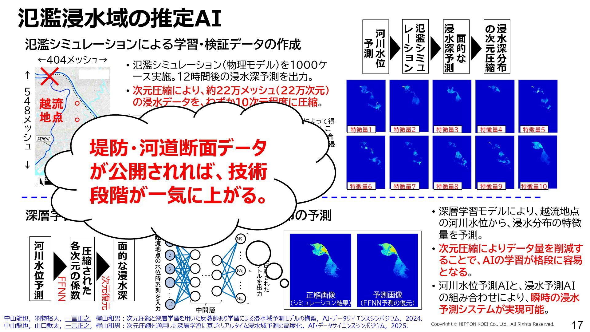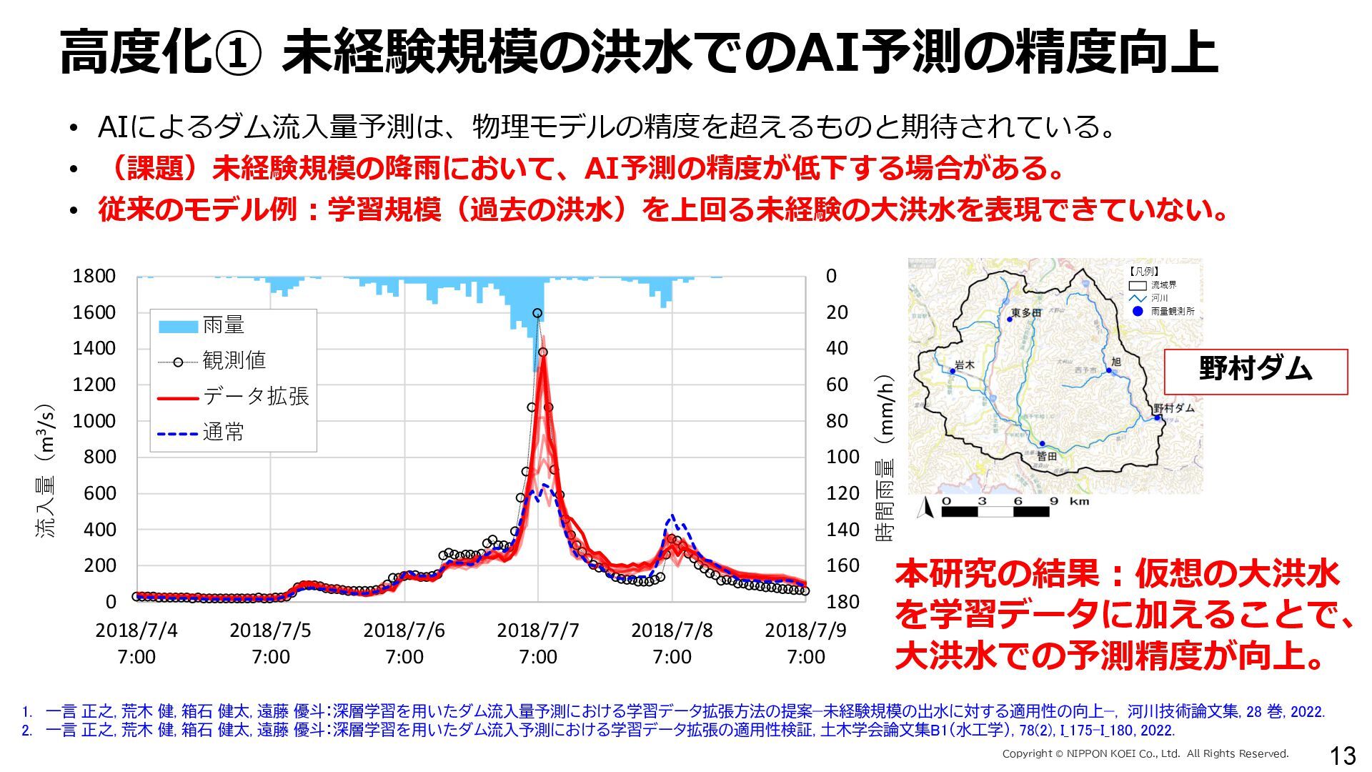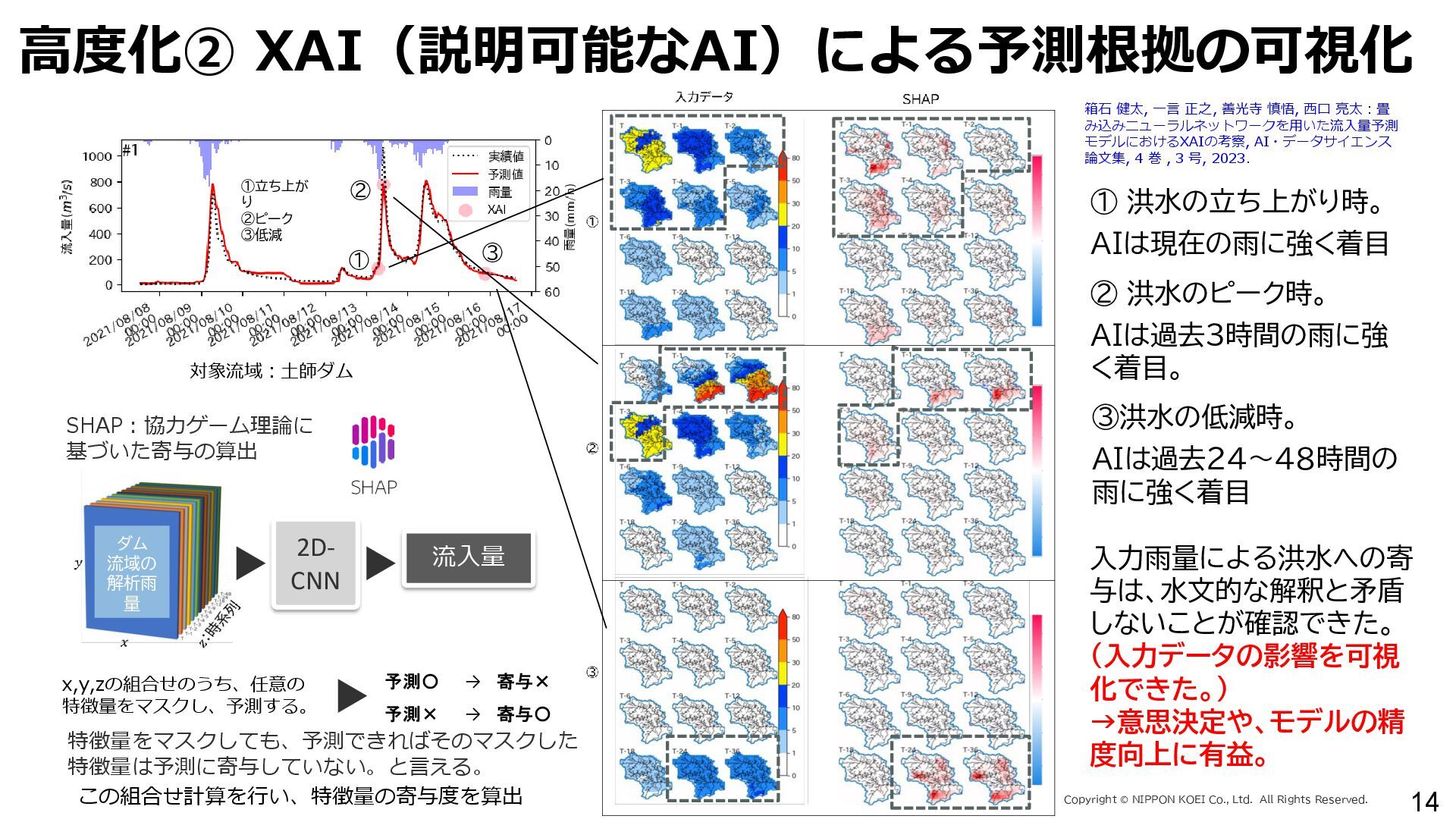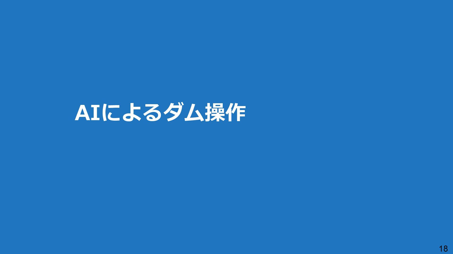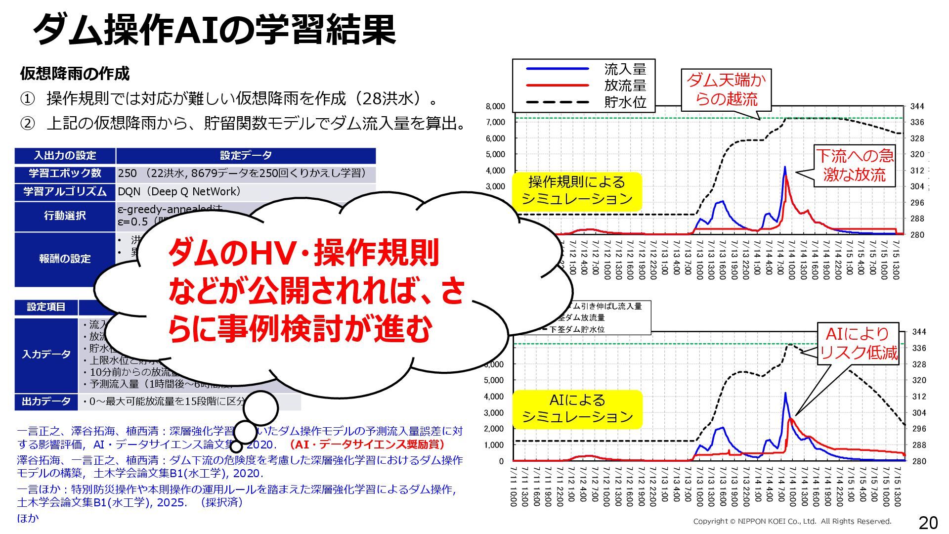 出力データ ・0~最大可能放流量を15段階に区分した値 280 288 296 304 312 320 328 336 344 0 1,000 2,000 3,000 4,000 5,000 6,000 7,000 8,000 7/11 10:00 7/11 13:00 7/11 16:00 7/11 19:00 7/11 22:00 7/12 1:00 7/12 4:00 7/12 7:00 7/12 10:00 7/12 13:00 7/12 16:00 7/12 19:00 7/12 22:00 7/13 1:00 7/13 4:00 7/13 7:00 7/13 10:00 7/13 13:00 7/13 16:00 7/13 19:00 7/13 22:00 7/14 1:00 7/14 4:00 7/14 7:00 7/14 10:00 7/14 13:00 7/14 16:00 7/14 19:00 7/14 22:00 7/15 1:00 7/15 4:00 7/15 7:00 7/15 10:00 7/15 13:00 貯水位(m) 流入量・放流量(m3/s) H24.7.13洪水 下筌ダム引き伸ばし流入量 下筌ダム放流量 下筌ダム貯水位 -80000 -70000 -60000 -50000 -40000 -30000 -20000 -10000 0 10000 -16,000 -14,000 -12,000 -10,000 -8,000 -6,000 -4,000 -2,000 0 2,000 7/11 10:00 7/11 13:00 7/11 16:00 7/11 19:00 7/11 22:00 7/12 1:00 7/12 4:00 7/12 7:00 7/12 10:00 7/12 13:00 7/12 16:00 7/12 19:00 7/12 22:00 7/13 1:00 7/13 4:00 7/13 7:00 7/13 10:00 7/13 13:00 7/13 16:00 7/13 19:00 7/13 22:00 7/14 1:00 7/14 4:00 7/14 7:00 7/14 10:00 7/14 13:00 7/14 16:00 7/14 19:00 7/14 22:00 7/15 1:00 7/15 4:00 7/15 7:00 7/15 10:00 7/15 13:00 得点 H24.7.13洪水 得点 総得点 280 288 296 304 312 320 328 336 344 7/11 13:00 7/11 16:00 7/11 19:00 7/11 22:00 7/12 1:00 7/12 4:00 7/12 7:00 7/12 10:00 7/12 13:00 7/12 16:00 7/12 19:00 7/12 22:00 7/13 1:00 7/13 4:00 7/13 7:00 7/13 10:00 7/13 13:00 7/13 16:00 7/13 19:00 7/13 22:00 7/14 1:00 7/14 4:00 7/14 7:00 7/14 10:00 7/14 13:00 7/14 16:00 7/14 19:00 7/14 22:00 7/15 1:00 7/15 4:00 7/15 7:00 7/15 10:00 7/15 13:00 貯水位(m) H24.7.13洪水 下筌ダム引き伸ばし流入量 下筌ダム放流量 下筌ダム貯水位 280 288 296 304 312 320 328 336 344 0 1,000 2,000 3,000 4,000 5,000 6,000 7,000 8,000 7/11 10:00 7/11 13:00 7/11 16:00 7/11 19:00 7/11 22:00 7/12 1:00 7/12 4:00 7/12 7:00 7/12 10:00 7/12 13:00 7/12 16:00 7/12 19:00 7/12 22:00 7/13 1:00 7/13 4:00 7/13 7:00 7/13 10:00 7/13 13:00 7/13 16:00 7/13 19:00 7/13 22:00 7/14 1:00 7/14 4:00 7/14 7:00 7/14 10:00 7/14 13:00 7/14 16:00 7/14 19:00 7/14 22:00 7/15 1:00 7/15 4:00 7/15 7:00 7/15 10:00 7/15 13:00 貯水位(m) 流入量・放流量(m3/s) H24.7.13洪水 下筌ダム引き伸ばし流入量 下筌ダム放流量 下筌ダム貯水位 得点 総得点 得点 総得点 操作規則による シミュレーション AIによる シミュレーション 下流への急 激な放流 AIにより リスク低減 AIにより リスク低減 20 ダム天端か らの越流 流入量 放流量 貯水位 0 1,000 2,000 3,000 4,000 5,000 6,000 7,000 8,000 7/11 10:00 7/11 13:00 7/11 16:00 7/11 19:00 7/11 22:00 7/12 1:00 7/12 4:00 7/12 7:00 7/12 10:00 7/12 13:00 7/12 16:00 7/12 19:00 7/12 22:00 7/13 1:00 7/13 4:00 7/13 7:00 流入量・放流量(m3/s) H 下筌ダム引き伸ばし流入量 下筌ダム放流量 下筌ダム貯水位 -6,000 -4,000 -2,000 0 2,000 得点 H 得点 総得点 入出力の設定 設定データ 学習エポック数 250 (22洪水, 8679データを250回くりかえし学習) 学習アルゴリズム DQN(Deep Q NetWork) 行動選択 ε-greedy-annealed法 ε=0.5(開始時)、ε=0.001(200エポック以降) 報酬の設定 • 洪水調節量(流入量-放流量)に応じて加点 • 異常洪水時防災操作の開始水位超過に応じて減点 • 上限水位(=設計洪水位)の超過に応じて減点 • 放流量の振動(前ステップとの差)に応じて減点 仮想降雨の作成 ① 操作規則では対応が難しい仮想降雨を作成(28洪水)。 ② 上記の仮想降雨から、貯留関数モデルでダム流入量を算出。 一言正之、澤谷拓海、植西清:深層強化学習を用いたダム操作モデルの予測流入量誤差に対 する影響評価,AI・データサイエンス論文集,2020.(AI・データサイエンス奨励賞) 澤谷拓海、一言正之、植西清:ダム下流の危険度を考慮した深層強化学習におけるダム操作 モデルの構築,土木学会論文集B1(水工学), 2020. 一言ほか:特別防災操作や本則操作の運用ルールを踏まえた深層強化学習によるダム操作, 土木学会論文集B1(水工学), 2025.(採択済) ほか Copyright Ⓒ NIPPON KOEI Co., Ltd. All Rights Reserved. ダムのHV・操作規則 などが公開されれば、さ らに事例検討が進む
