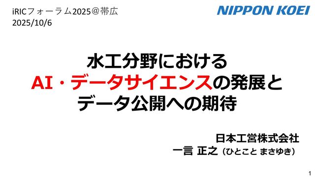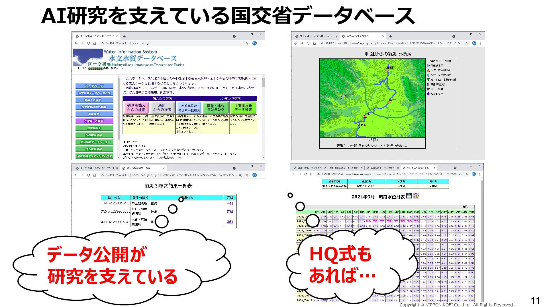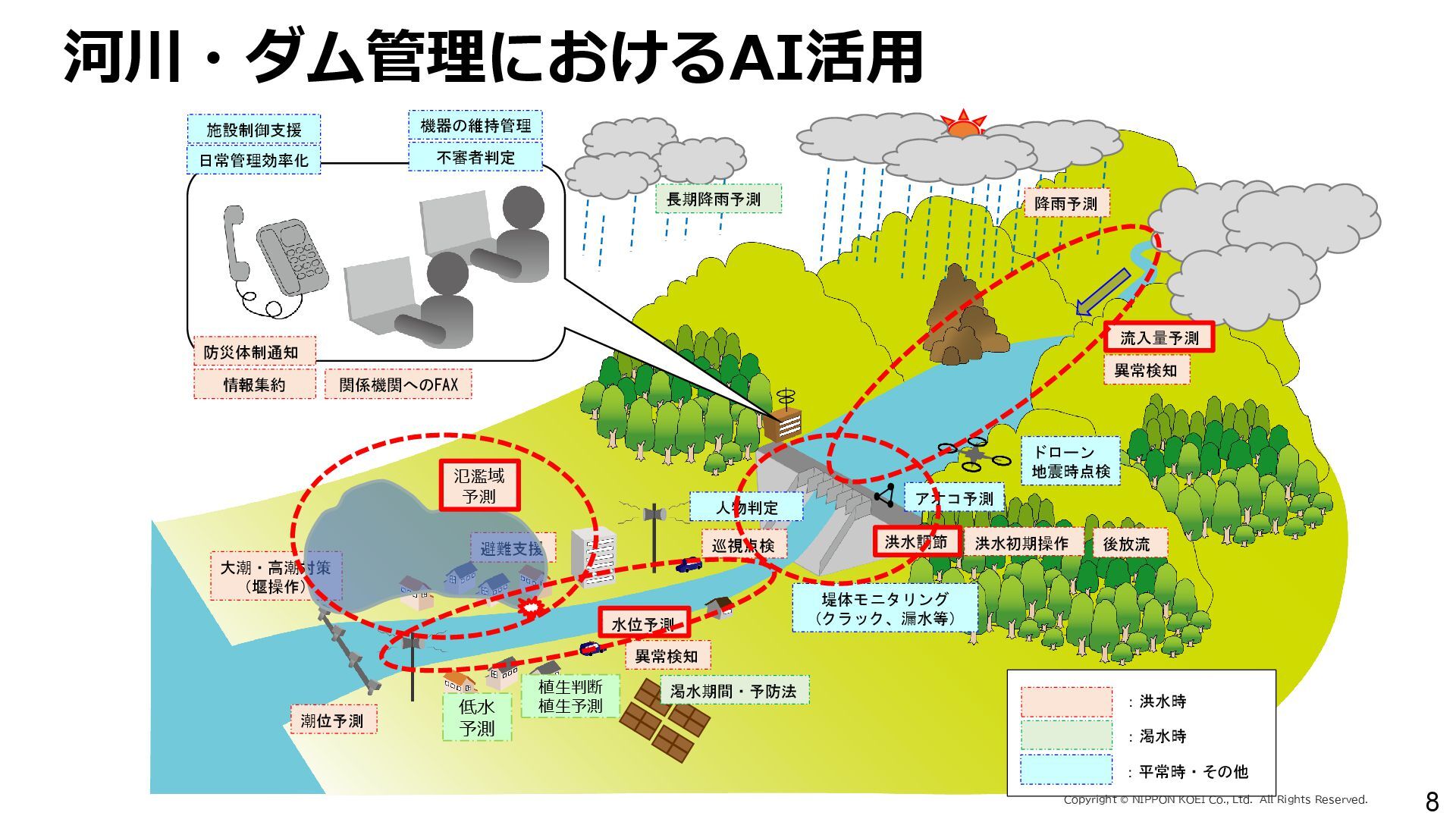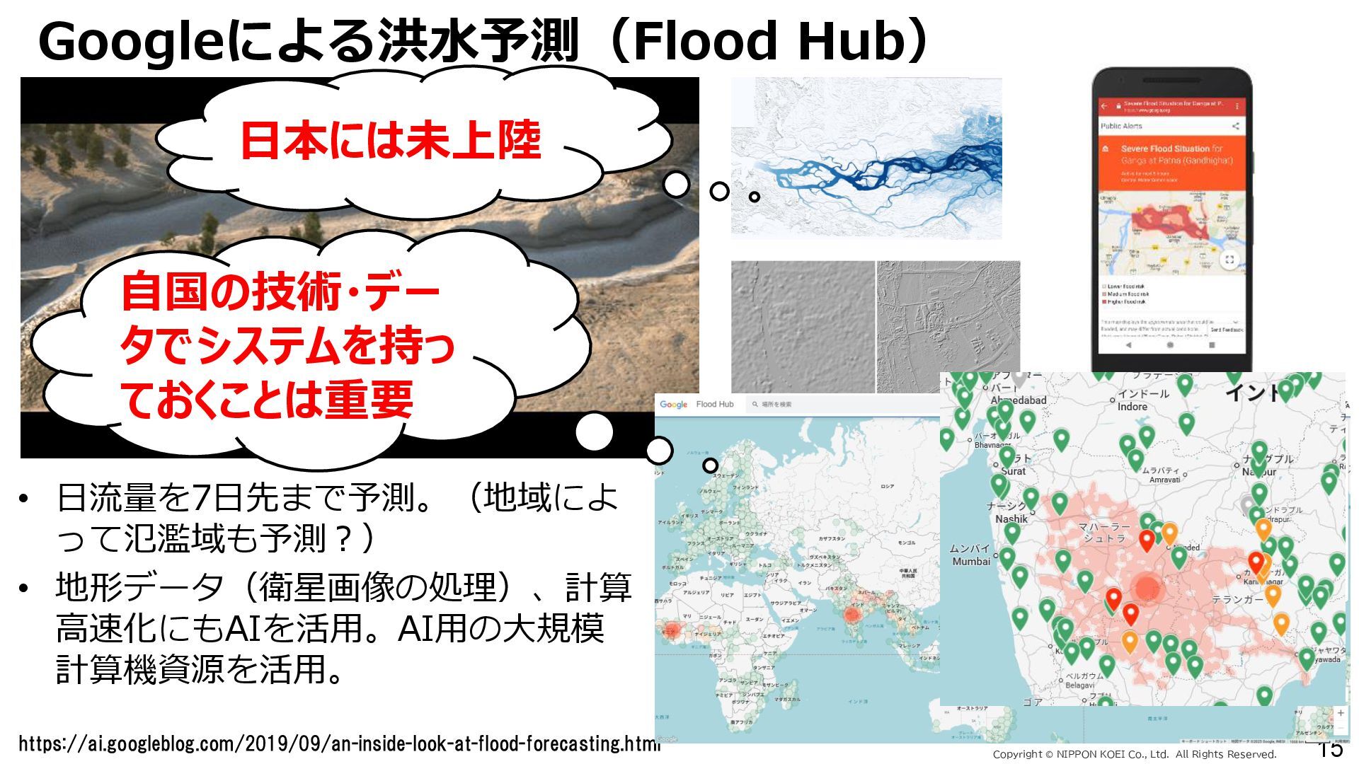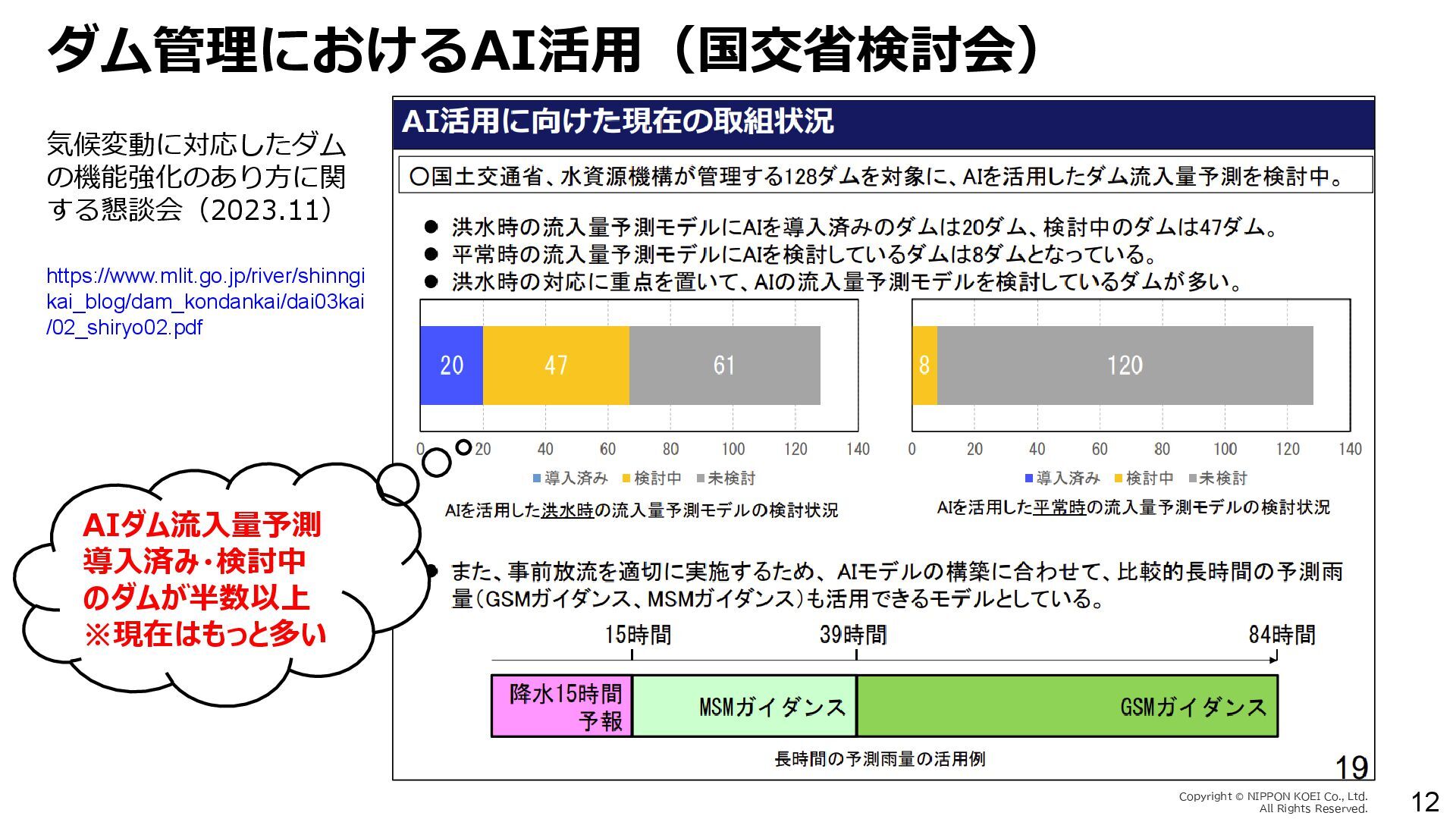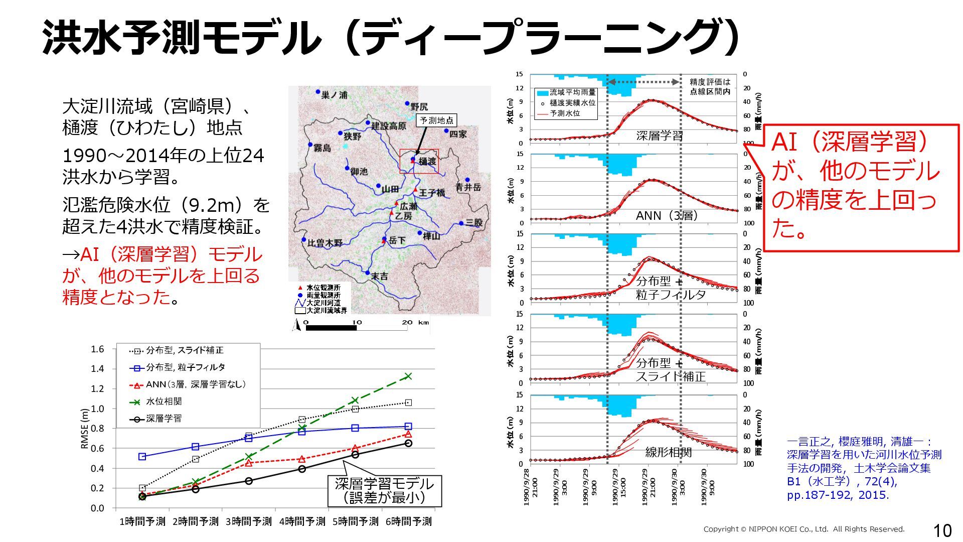出力データ ・0~最大可能放流量を15段階に区分した値 280 288 296 304 312 320 328 336 344 0 1,000 2,000 3,000 4,000 5,000 6,000 7,000 8,000 7/11 10:00 7/11 13:00 7/11 16:00 7/11 19:00 7/11 22:00 7/12 1:00 7/12 4:00 7/12 7:00 7/12 10:00 7/12 13:00 7/12 16:00 7/12 19:00 7/12 22:00 7/13 1:00 7/13 4:00 7/13 7:00 7/13 10:00 7/13 13:00 7/13 16:00 7/13 19:00 7/13 22:00 7/14 1:00 7/14 4:00 7/14 7:00 7/14 10:00 7/14 13:00 7/14 16:00 7/14 19:00 7/14 22:00 7/15 1:00 7/15 4:00 7/15 7:00 7/15 10:00 7/15 13:00 貯水位(m) 流入量・放流量(m3/s) H24.7.13洪水 下筌ダム引き伸ばし流入量 下筌ダム放流量 下筌ダム貯水位 -80000 -70000 -60000 -50000 -40000 -30000 -20000 -10000 0 10000 -16,000 -14,000 -12,000 -10,000 -8,000 -6,000 -4,000 -2,000 0 2,000 7/11 10:00 7/11 13:00 7/11 16:00 7/11 19:00 7/11 22:00 7/12 1:00 7/12 4:00 7/12 7:00 7/12 10:00 7/12 13:00 7/12 16:00 7/12 19:00 7/12 22:00 7/13 1:00 7/13 4:00 7/13 7:00 7/13 10:00 7/13 13:00 7/13 16:00 7/13 19:00 7/13 22:00 7/14 1:00 7/14 4:00 7/14 7:00 7/14 10:00 7/14 13:00 7/14 16:00 7/14 19:00 7/14 22:00 7/15 1:00 7/15 4:00 7/15 7:00 7/15 10:00 7/15 13:00 得点 H24.7.13洪水 得点 総得点 280 288 296 304 312 320 328 336 344 7/11 13:00 7/11 16:00 7/11 19:00 7/11 22:00 7/12 1:00 7/12 4:00 7/12 7:00 7/12 10:00 7/12 13:00 7/12 16:00 7/12 19:00 7/12 22:00 7/13 1:00 7/13 4:00 7/13 7:00 7/13 10:00 7/13 13:00 7/13 16:00 7/13 19:00 7/13 22:00 7/14 1:00 7/14 4:00 7/14 7:00 7/14 10:00 7/14 13:00 7/14 16:00 7/14 19:00 7/14 22:00 7/15 1:00 7/15 4:00 7/15 7:00 7/15 10:00 7/15 13:00 貯水位(m) H24.7.13洪水 下筌ダム引き伸ばし流入量 下筌ダム放流量 下筌ダム貯水位 280 288 296 304 312 320 328 336 344 0 1,000 2,000 3,000 4,000 5,000 6,000 7,000 8,000 7/11 10:00 7/11 13:00 7/11 16:00 7/11 19:00 7/11 22:00 7/12 1:00 7/12 4:00 7/12 7:00 7/12 10:00 7/12 13:00 7/12 16:00 7/12 19:00 7/12 22:00 7/13 1:00 7/13 4:00 7/13 7:00 7/13 10:00 7/13 13:00 7/13 16:00 7/13 19:00 7/13 22:00 7/14 1:00 7/14 4:00 7/14 7:00 7/14 10:00 7/14 13:00 7/14 16:00 7/14 19:00 7/14 22:00 7/15 1:00 7/15 4:00 7/15 7:00 7/15 10:00 7/15 13:00 貯水位(m) 流入量・放流量(m3/s) H24.7.13洪水 下筌ダム引き伸ばし流入量 下筌ダム放流量 下筌ダム貯水位 得点 総得点 得点 総得点 操作規則による シミュレーション AIによる シミュレーション 下流への急 激な放流 AIにより リスク低減 AIにより リスク低減 20 ダム天端か らの越流 流入量 放流量 貯水位 0 1,000 2,000 3,000 4,000 5,000 6,000 7,000 8,000 7/11 10:00 7/11 13:00 7/11 16:00 7/11 19:00 7/11 22:00 7/12 1:00 7/12 4:00 7/12 7:00 7/12 10:00 7/12 13:00 7/12 16:00 7/12 19:00 7/12 22:00 7/13 1:00 7/13 4:00 7/13 7:00 流入量・放流量(m3/s) H 下筌ダム引き伸ばし流入量 下筌ダム放流量 下筌ダム貯水位 -6,000 -4,000 -2,000 0 2,000 得点 H 得点 総得点 入出力の設定 設定データ 学習エポック数 250 (22洪水, 8679データを250回くりかえし学習) 学習アルゴリズム DQN(Deep Q NetWork) 行動選択 ε-greedy-annealed法 ε=0.5(開始時)、ε=0.001(200エポック以降) 報酬の設定 • 洪水調節量(流入量-放流量)に応じて加点 • 異常洪水時防災操作の開始水位超過に応じて減点 • 上限水位(=設計洪水位)の超過に応じて減点 • 放流量の振動(前ステップとの差)に応じて減点 仮想降雨の作成 ① 操作規則では対応が難しい仮想降雨を作成(28洪水)。 ② 上記の仮想降雨から、貯留関数モデルでダム流入量を算出。 一言正之、澤谷拓海、植西清:深層強化学習を用いたダム操作モデルの予測流入量誤差に対 する影響評価,AI・データサイエンス論文集,2020.(AI・データサイエンス奨励賞) 澤谷拓海、一言正之、植西清:ダム下流の危険度を考慮した深層強化学習におけるダム操作 モデルの構築,土木学会論文集B1(水工学), 2020. 一言ほか:特別防災操作や本則操作の運用ルールを踏まえた深層強化学習によるダム操作, 土木学会論文集B1(水工学), 2025.(採択済) ほか Copyright Ⓒ NIPPON KOEI Co., Ltd. All Rights Reserved. ダムのHV・操作規則 などが公開されれば、さ らに事例検討が進む