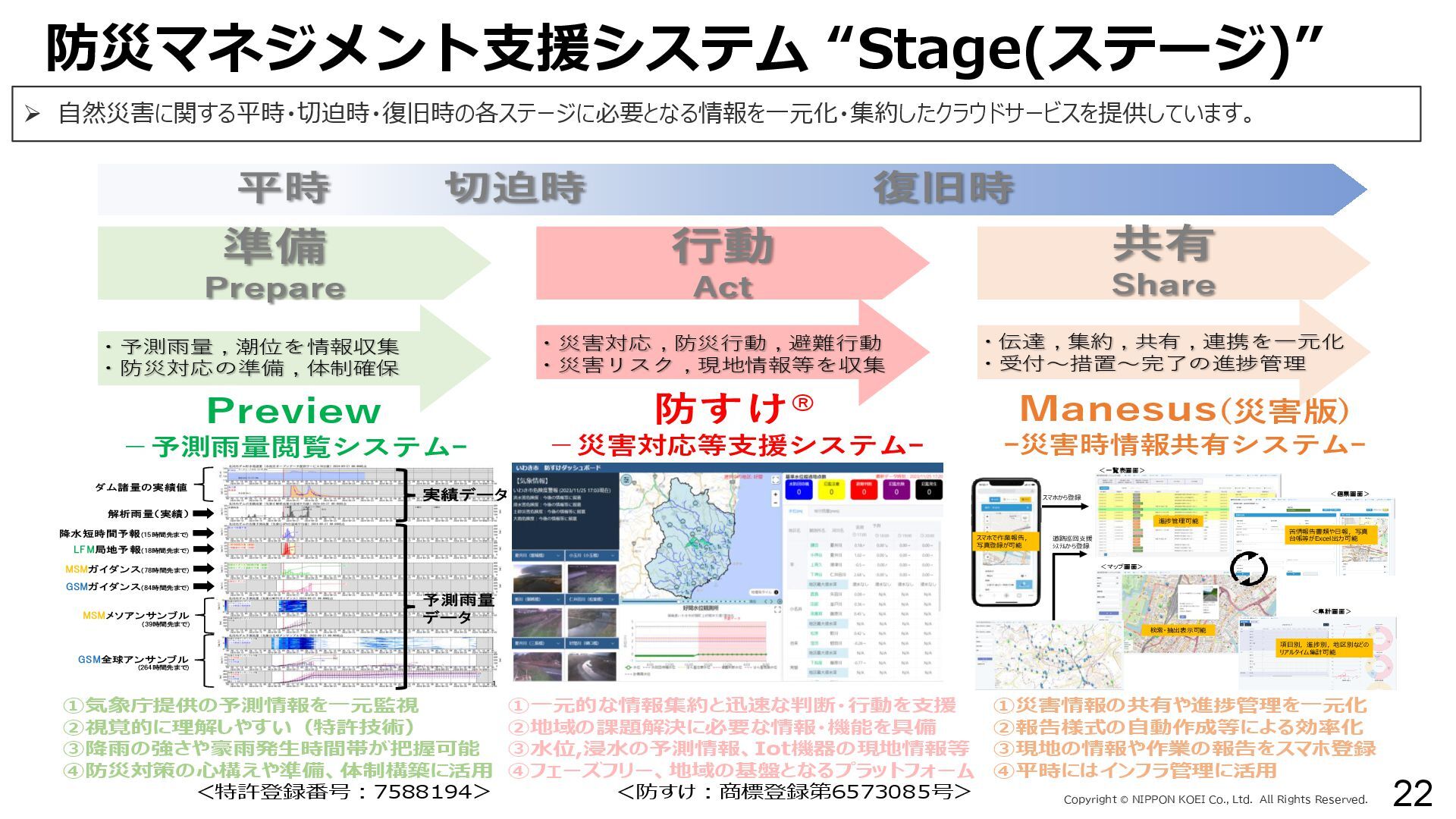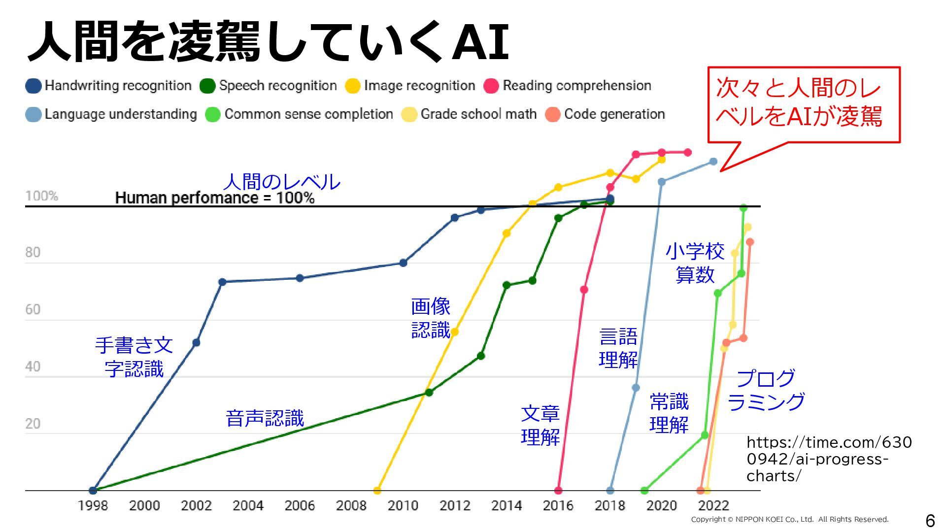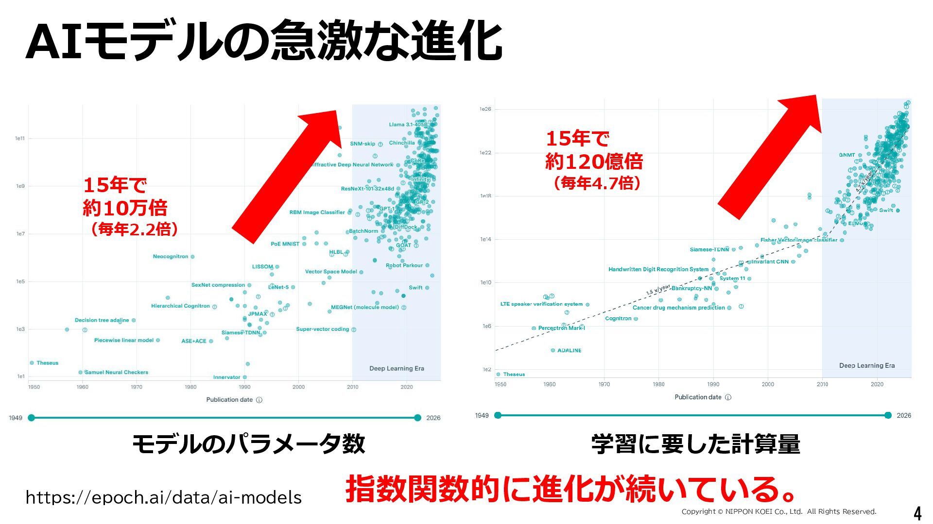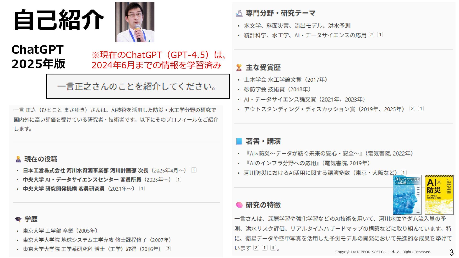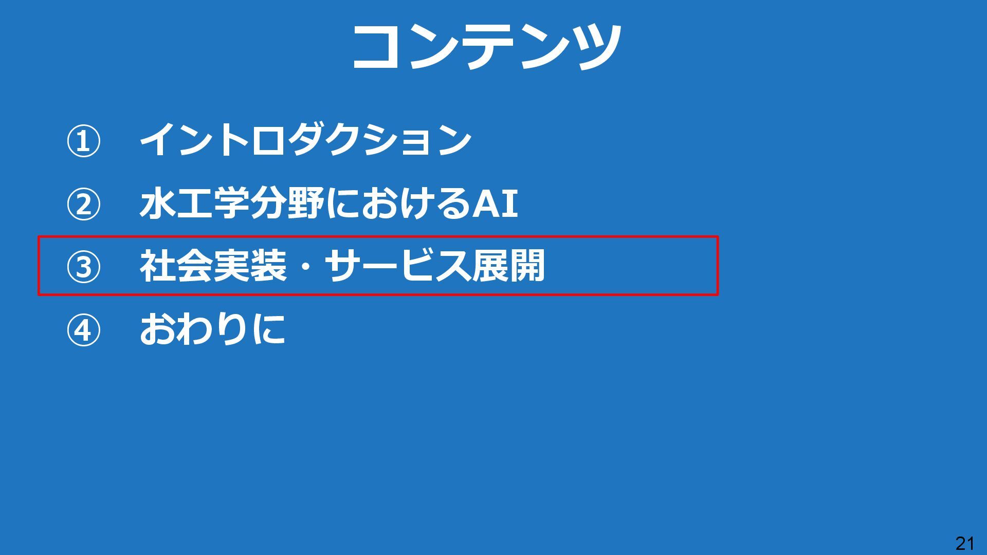 出力データ ・0~最大可能放流量を15段階に区分した値 280 288 296 304 312 320 328 336 344 0 1,000 2,000 3,000 4,000 5,000 6,000 7,000 8,000 7/11 10:00 7/11 13:00 7/11 16:00 7/11 19:00 7/11 22:00 7/12 1:00 7/12 4:00 7/12 7:00 7/12 10:00 7/12 13:00 7/12 16:00 7/12 19:00 7/12 22:00 7/13 1:00 7/13 4:00 7/13 7:00 7/13 10:00 7/13 13:00 7/13 16:00 7/13 19:00 7/13 22:00 7/14 1:00 7/14 4:00 7/14 7:00 7/14 10:00 7/14 13:00 7/14 16:00 7/14 19:00 7/14 22:00 7/15 1:00 7/15 4:00 7/15 7:00 7/15 10:00 7/15 13:00 貯水位(m) 流入量・放流量(m3/s) H24.7.13洪水 下筌ダム引き伸ばし流入量 下筌ダム放流量 下筌ダム貯水位 -80000 -70000 -60000 -50000 -40000 -30000 -20000 -10000 0 10000 -16,000 -14,000 -12,000 -10,000 -8,000 -6,000 -4,000 -2,000 0 2,000 7/11 10:00 7/11 13:00 7/11 16:00 7/11 19:00 7/11 22:00 7/12 1:00 7/12 4:00 7/12 7:00 7/12 10:00 7/12 13:00 7/12 16:00 7/12 19:00 7/12 22:00 7/13 1:00 7/13 4:00 7/13 7:00 7/13 10:00 7/13 13:00 7/13 16:00 7/13 19:00 7/13 22:00 7/14 1:00 7/14 4:00 7/14 7:00 7/14 10:00 7/14 13:00 7/14 16:00 7/14 19:00 7/14 22:00 7/15 1:00 7/15 4:00 7/15 7:00 7/15 10:00 7/15 13:00 得点 H24.7.13洪水 得点 総得点 280 288 296 304 312 320 328 336 344 7/11 13:00 7/11 16:00 7/11 19:00 7/11 22:00 7/12 1:00 7/12 4:00 7/12 7:00 7/12 10:00 7/12 13:00 7/12 16:00 7/12 19:00 7/12 22:00 7/13 1:00 7/13 4:00 7/13 7:00 7/13 10:00 7/13 13:00 7/13 16:00 7/13 19:00 7/13 22:00 7/14 1:00 7/14 4:00 7/14 7:00 7/14 10:00 7/14 13:00 7/14 16:00 7/14 19:00 7/14 22:00 7/15 1:00 7/15 4:00 7/15 7:00 7/15 10:00 7/15 13:00 貯水位(m) H24.7.13洪水 下筌ダム引き伸ばし流入量 下筌ダム放流量 下筌ダム貯水位 280 288 296 304 312 320 328 336 344 0 1,000 2,000 3,000 4,000 5,000 6,000 7,000 8,000 7/11 10:00 7/11 13:00 7/11 16:00 7/11 19:00 7/11 22:00 7/12 1:00 7/12 4:00 7/12 7:00 7/12 10:00 7/12 13:00 7/12 16:00 7/12 19:00 7/12 22:00 7/13 1:00 7/13 4:00 7/13 7:00 7/13 10:00 7/13 13:00 7/13 16:00 7/13 19:00 7/13 22:00 7/14 1:00 7/14 4:00 7/14 7:00 7/14 10:00 7/14 13:00 7/14 16:00 7/14 19:00 7/14 22:00 7/15 1:00 7/15 4:00 7/15 7:00 7/15 10:00 7/15 13:00 貯水位(m) 流入量・放流量(m3/s) H24.7.13洪水 下筌ダム引き伸ばし流入量 下筌ダム放流量 下筌ダム貯水位 得点 総得点 得点 総得点 操作規則による シミュレーション AIによる シミュレーション 下流への急 激な放流 AIにより リスク低減 AIにより リスク低減 20 ダム天端か らの越流 流入量 放流量 貯水位 0 1,000 2,000 3,000 4,000 5,000 6,000 7,000 8,000 7/11 10:00 7/11 13:00 7/11 16:00 7/11 19:00 7/11 22:00 7/12 1:00 7/12 4:00 7/12 7:00 7/12 10:00 7/12 13:00 7/12 16:00 7/12 19:00 7/12 22:00 7/13 1:00 7/13 4:00 7/13 7:00 流入量・放流量(m3/s) H 下筌ダム引き伸ばし流入量 下筌ダム放流量 下筌ダム貯水位 -6,000 -4,000 -2,000 0 2,000 得点 H 得点 総得点 入出力の設定 設定データ 学習エポック数 250 (22洪水, 8679データを250回くりかえし学習) 学習アルゴリズム DQN(Deep Q NetWork) 行動選択 ε-greedy-annealed法 ε=0.5(開始時)、ε=0.001(200エポック以降) 報酬の設定 • 洪水調節量(流入量-放流量)に応じて加点 • 異常洪水時防災操作の開始水位超過に応じて減点 • 上限水位(=設計洪水位)の超過に応じて減点 • 放流量の振動(前ステップとの差)に応じて減点 仮想降雨の作成 ① 操作規則では対応が難しい仮想降雨を作成(28洪水)。 ② 上記の仮想降雨から、貯留関数モデルでダム流入量を算出。 一言正之、澤谷拓海、植西清:深層強化学習を用いたダム操作モデルの予測流入量誤差に対 する影響評価,AI・データサイエンス論文集,2020.(AI・データサイエンス奨励賞) 澤谷拓海、一言正之、植西清:ダム下流の危険度を考慮した深層強化学習におけるダム操作 モデルの構築,土木学会論文集B1(水工学), 2020. 一言ほか:特別防災操作や本則操作の運用ルールを踏まえた深層強化学習によるダム操作, 土木学会論文集B1(水工学), 2025.(採択済) ほか Copyright Ⓒ NIPPON KOEI Co., Ltd. All Rights Reserved. ダムのHV・操作規則 などが公開されれば、さ らに事例検討が進む