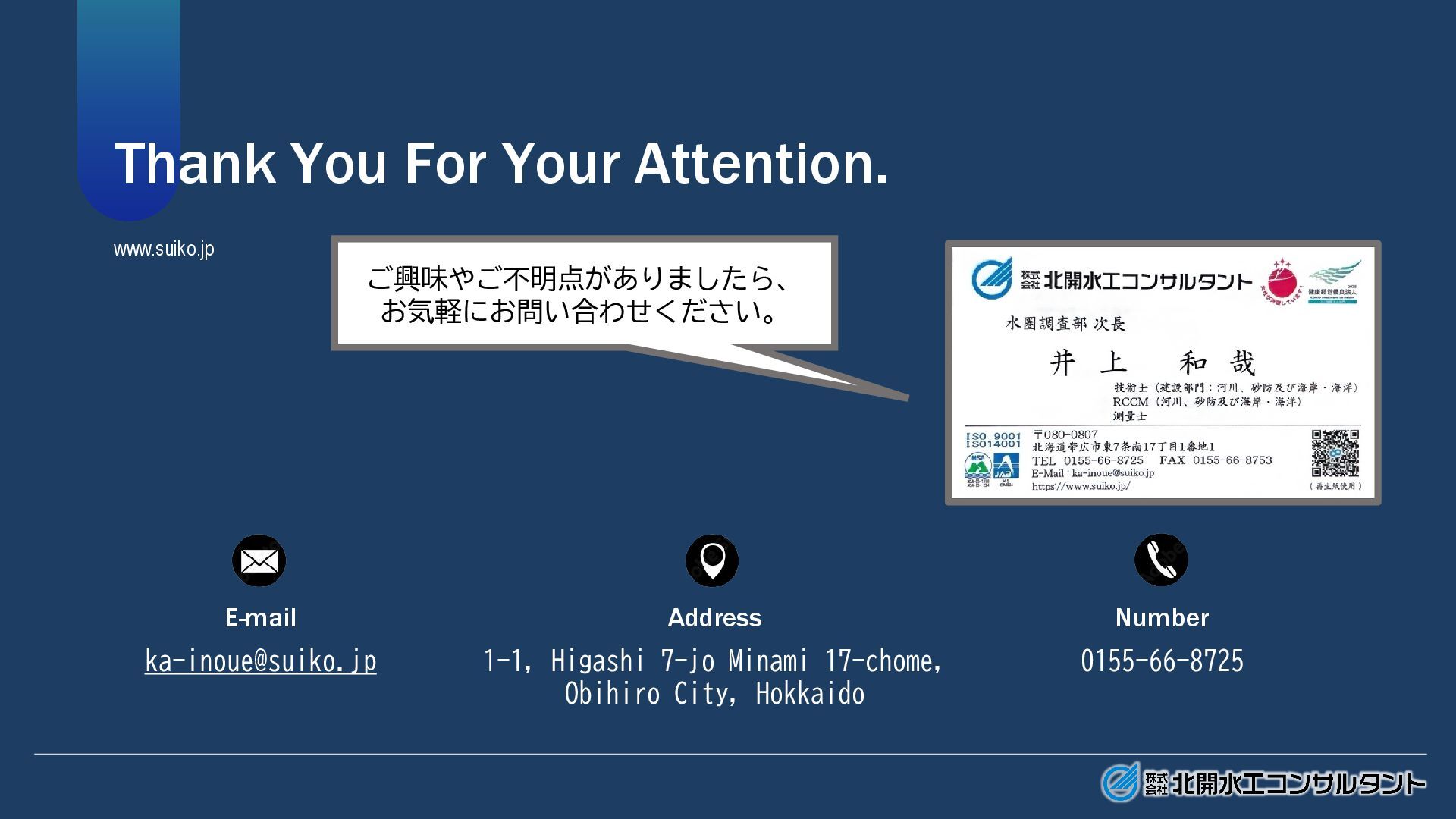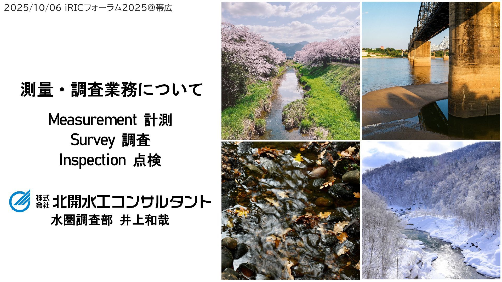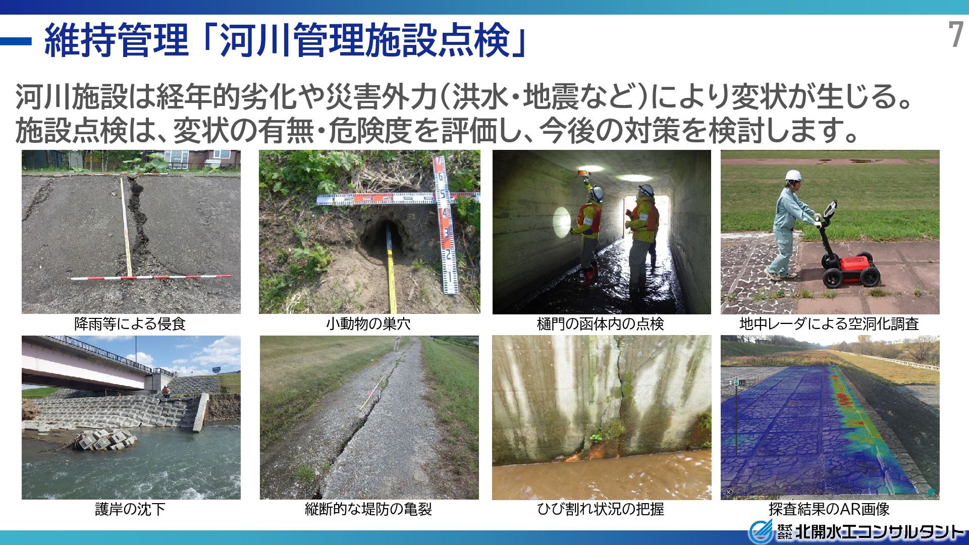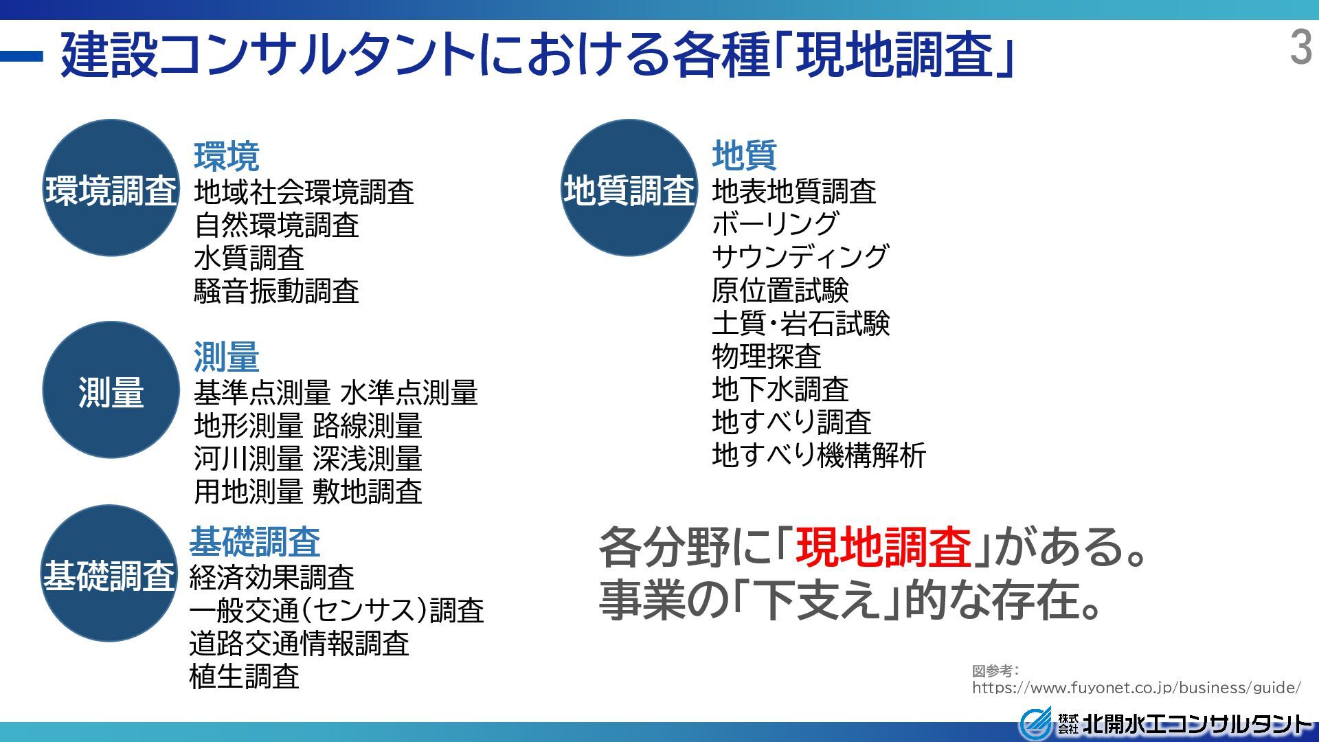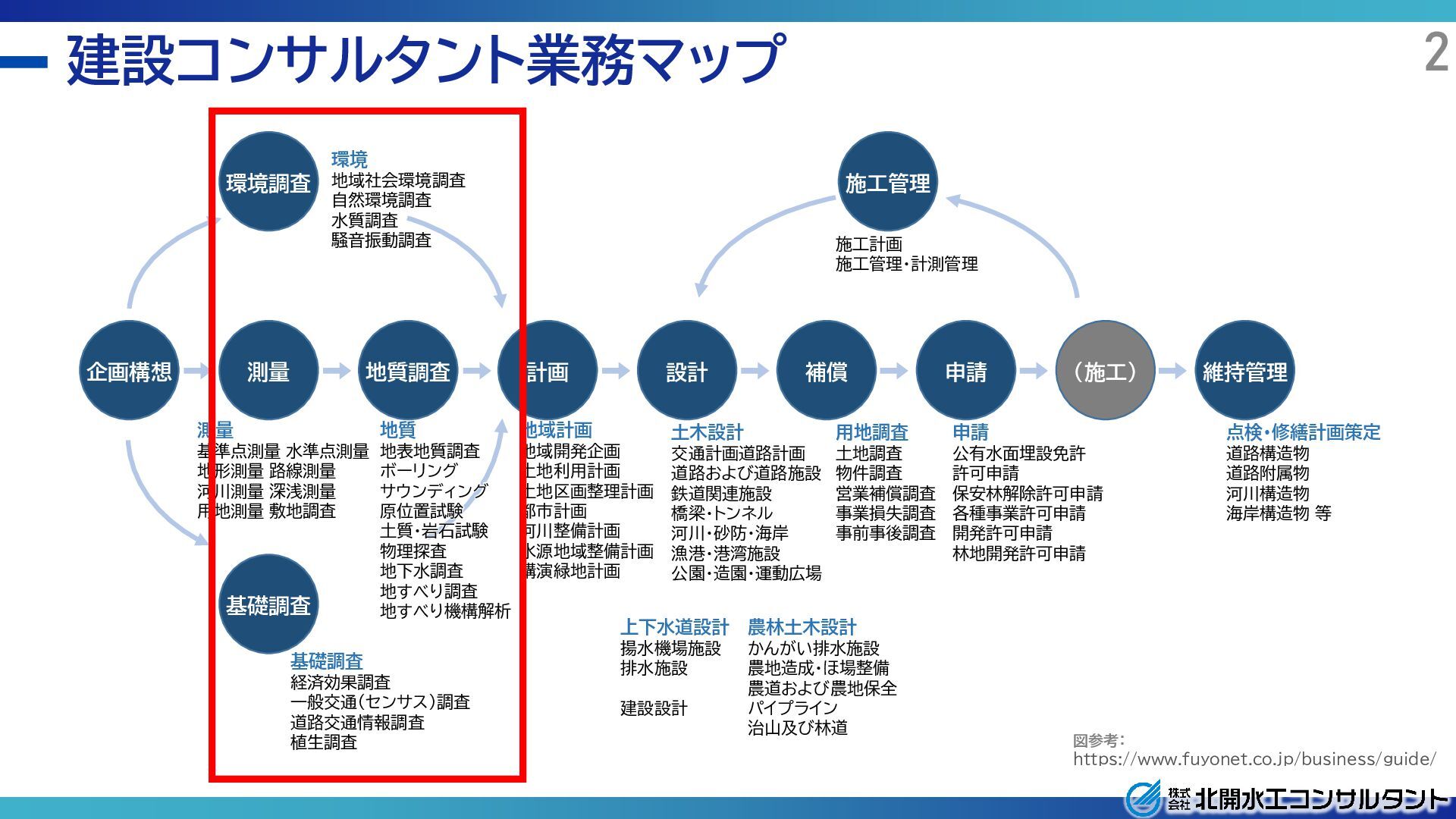 設計 補償 申請 (施工) 維持管理 環境 地域社会環境調査 自然環境調査 水質調査 騒音振動調査 測量 基準点測量 水準点測量 地形測量 路線測量 河川測量 深浅測量 用地測量 敷地調査 基礎調査 経済効果調査 一般交通(センサス)調査 道路交通情報調査 植生調査 地質 地表地質調査 ボーリング サウンディング 原位置試験 土質・岩石試験 物理探査 地下水調査 地すべり調査 地すべり機構解析 地域計画 地域開発企画 土地利用計画 土地区画整理計画 都市計画 河川整備計画 水源地域整備計画 講演緑地計画 上下水道設計 揚水機場施設 排水施設 建設設計 農林土木設計 かんがい排水施設 農地造成・ほ場整備 農道および農地保全 パイプライン 治山及び林道 土木設計 交通計画道路計画 道路および道路施設 鉄道関連施設 橋梁・トンネル 河川・砂防・海岸 漁港・港湾施設 公園・造園・運動広場 用地調査 土地調査 物件調査 営業補償調査 事業損失調査 事前事後調査 申請 公有水面埋設免許 許可申請 保安林解除許可申請 各種事業許可申請 開発許可申請 林地開発許可申請 点検・修繕計画策定 道路構造物 道路附属物 河川構造物 海岸構造物 等 施工計画 施工管理・計測管理 施工管理