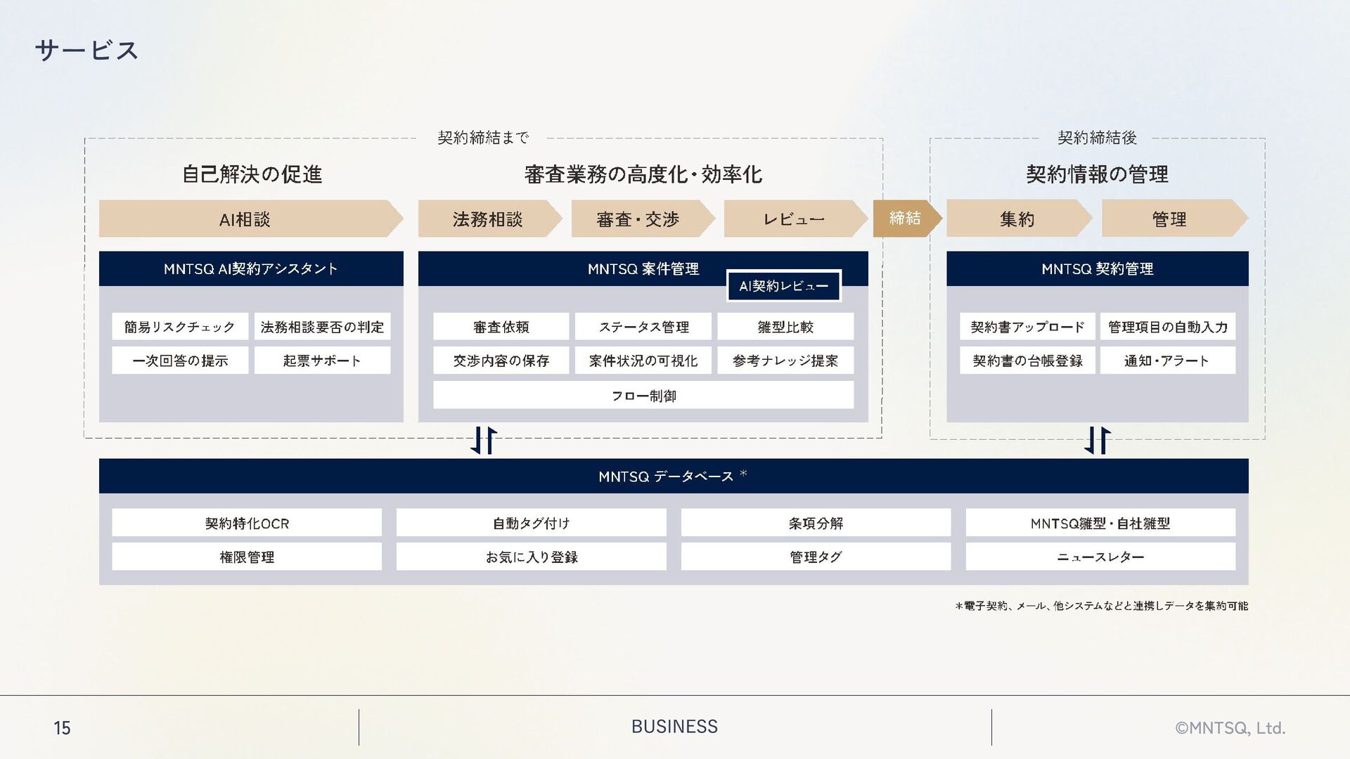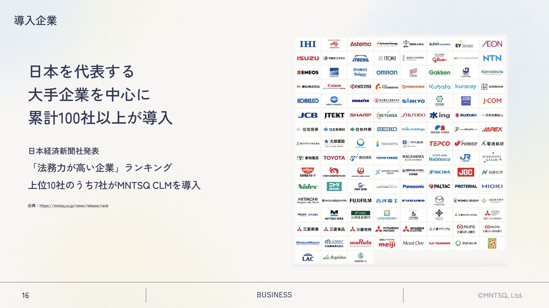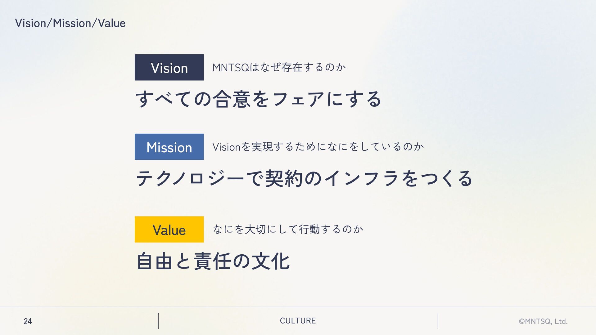 MNTSQ株式会社は、「すべての合意をフェアにする」ことを掲げて、2018年11月に設立されました。四大法律事務所の一つである長島・大野・常松法律事務所のノウハウと、契約・法務に特化した独自の機械学習との掛け合わせをコアとし、顧客の業務変革を支援します。契約の作成・審査・管理からナレッジ化までを一気通貫でサポートし、契約・法務業務を変革するサービス「MNTSQ CLM」を提供しています。