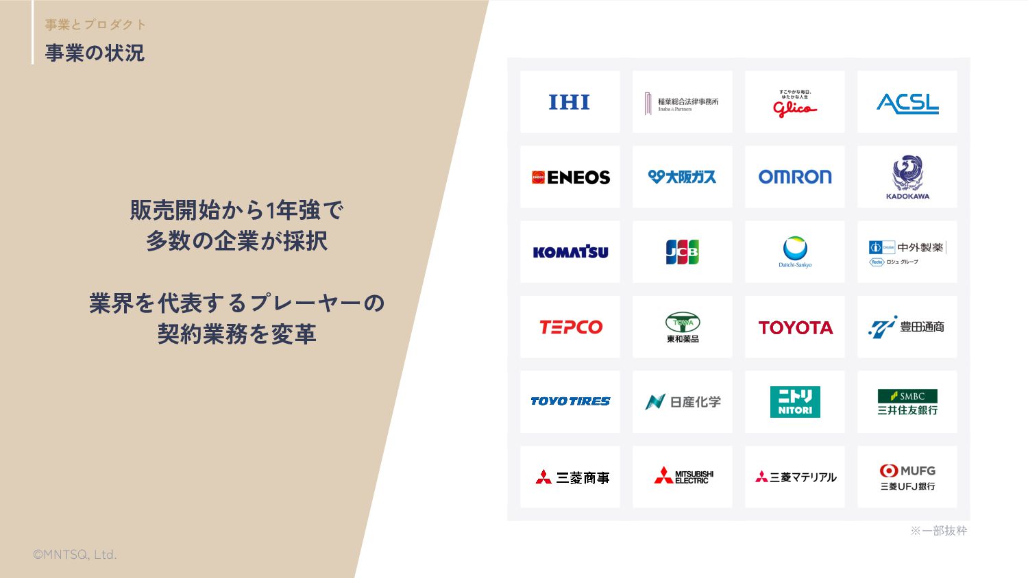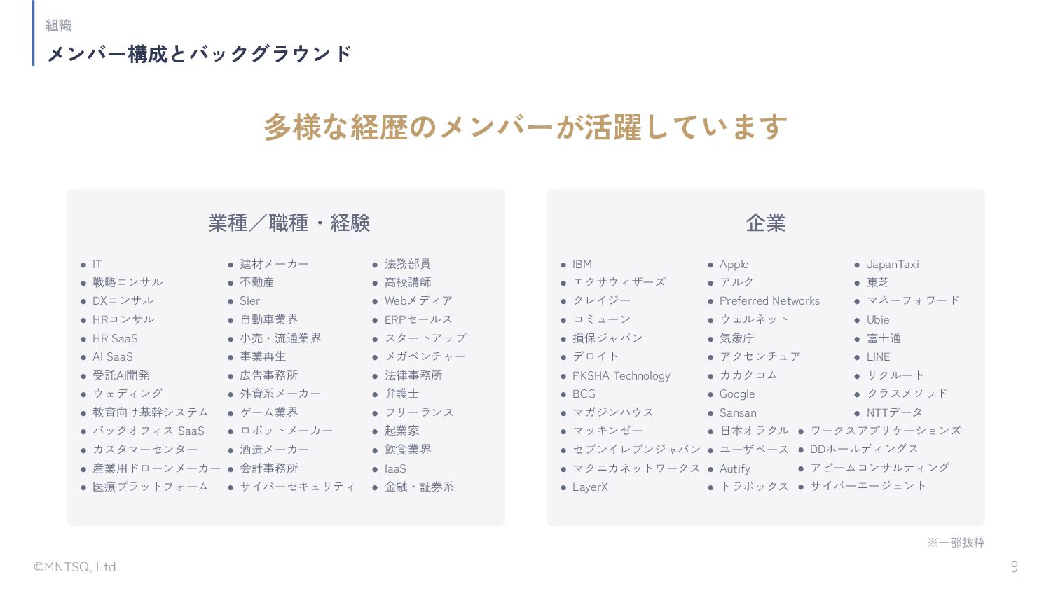 • エクサウィザーズ • クレイジー • コミューン • 損保ジャパン • デロイト • PKSHA Technology • BCG • マガジンハウス • マッキンゼー • セブンイレブンジャパン • マクニカネットワークス • LayerX ※一部抜粋 • Apple • アルク • Preferred Networks • ウェルネット • 気象庁 • アクセンチュア • カカクコム • Google • Sansan • 日本オラクル • ユーザベース • Autify • トラボックス • JapanTaxi • 東芝 • マネーフォワード • Ubie • 富士通 • LINE • リクルート • クラスメソッド • NTTデータ • ワークスアプリケーションズ • DDホールディングス • アビームコンサルティング • サイバーエージェント • IT • 戦略コンサル • DXコンサル • HRコンサル • HR SaaS • AI SaaS • 受託AI開発 • ウェディング • 教育向け基幹システム • バックオフィス SaaS • カスタマーセンター • 産業用ドローンメーカー • 医療プラットフォーム • 建材メーカー • 不動産 • SIer • 自動車業界 • 小売・流通業界 • 事業再生 • 広告事務所 • 外資系メーカー • ゲーム業界 • ロボットメーカー • 酒造メーカー • 会計事務所 • サイバーセキュリティ • 法務部員 • 高校講師 • Webメディア • ERPセールス • スタートアップ • メガベンチャー • 法律事務所 • 弁護士 • フリーランス • 起業家 • 飲食業界 • IaaS • 金融・証券系