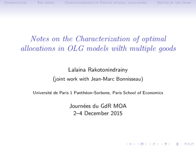 the proof Additional assumptions Let x = (xi ) ∈ i∈I Xi a WPO allocation, such that: • Assumption B: there exist ¯ χ > 0 and χ > 0 such that for all t ≥ 1, ¯ et ≤ ¯ χ1Lt , for all t ≥ 1, χ(1Lt , 1Lt+1 ) ≤ xi for all i ∈ It and χ1L1 ≤ xi for all i ∈ I0; • Assumption C: there exists r > 0 such that for all i ∈ I, B(xi + rγi (xi ), r) ⊂ Pi (xi ); • Assumption C’: there exists ¯ r > 0 such that for all i ∈ I−0 (resp. i ∈ I0), for all ξi ∈ ¯ Pi (xi ), if ξi ≤ (et, et+1) (resp. ξi ≤ e1), then ξi ∈ ¯ B(xi + ¯ rγi (xi ), ¯ r); • Assumption G: there exists ν ≥ ν > 0 such that for all t ≥ 1, i ∈ It, ν ≤ γi t (xi ) γi t+1 (xi ) ≤ ν