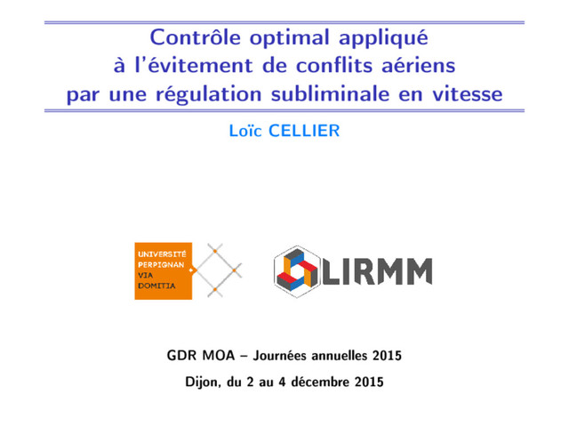 de conits aériens par une régulation subliminale en vitesse PMP conditions on postzone For all (xi, vi, z1,i, z2,i, z0,i, ui), the Hamiltonian of problem (Pi) is : Hi (xi(t), vi(t), z1,i(t), z2,i(t), z0,i, ui(t)) = z1,i(t)vi(t)di + z2,i(t)ui(t) + z0,iu 2 i (t). We obtain, for almost each instant t in [tZ, tf ]: ˙ xi(t) = vi(t)di, ˙ vi(t) = z2,i(t) 2 , ˙ z1,i(t) = 0 R 2 , ˙ z2,i(t) = − z1,i(t)di. ui(t) = v tf i − v tZ i tf − tZ , vi(t) = v tf i − v tZ i tf − tZ (t − tf ) + v tf i , xi(t) = v tf i − v tZ i tf − tZ di t2 2 + v tf i − v tf i − v tZ i tf − tZ tf dit − v tf i − v tZ i tf − tZ (tZ − tf ) + v tf i ditZ + x tZ i . Result: On [tZ, tf ], the optimal acceleration is constant ! 15/38