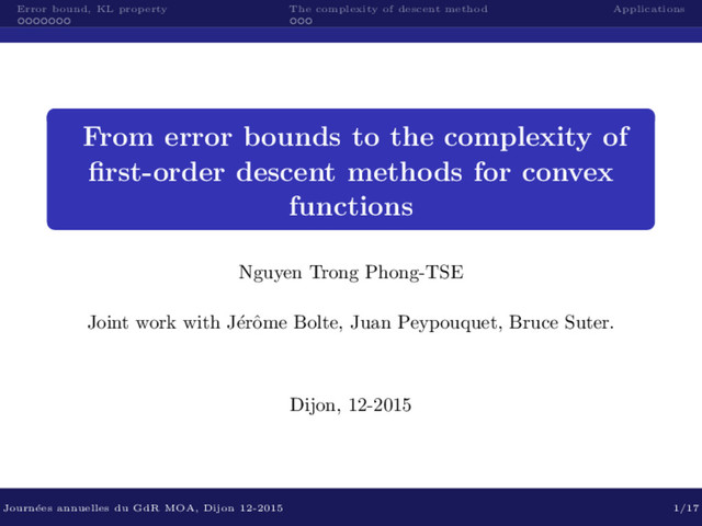 Error bound implies KL Theorem Let f : H → R ∪ {∞} be a proper, convex and lower-semicontinuous, with min f = 0. Let η > 0, ϕ ∈ K(0, η), c > 0, ρ > 0, η ∈ (0, 1) and ¯ x ∈ argmin f. (i) If ∂0f(x) ≥ c|f(x)|θ, ∀x ∈ [0 < f < η] ∩ B(¯ x, ρ), then dist (x, S) ≤ [c(1 − θ)]−1|f(x)|1−θ, ∀x ∈ [0 < f < η] ∩ B(¯ x, ρ). (ii) Conversely, if c|f(x)|1−θ ≥ dist (x, S), ∀x ∈ [0 < f < η] ∩ B(¯ x, ρ), then ∂0f(x) ≥ c−1|f(x)|θ, ∀x ∈ [0 < f < η] ∩ B(¯ x, ρ). Journ´ ees annuelles du GdR MOA, Dijon 12-2015 9/17