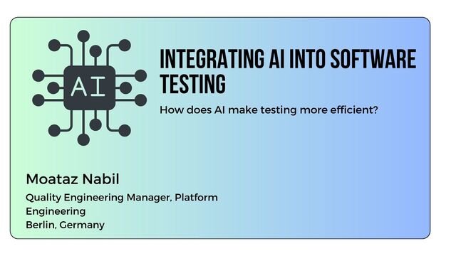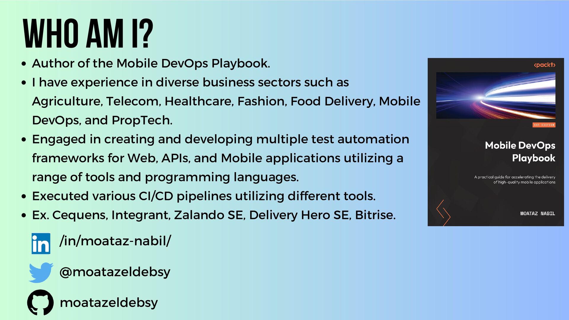 have experience in diverse business sectors such as Agriculture, Telecom, Healthcare, Fashion, Food Delivery, Mobile DevOps, and PropTech. Engaged in creating and developing multiple test automation frameworks for Web, APIs, and Mobile applications utilizing a range of tools and programming languages. Executed various CI/CD pipelines utilizing different tools. Ex. Cequens, Integrant, Zalando SE, Delivery Hero SE, Bitrise. /in/moataz-nabil/ @moatazeldebsy moatazeldebsy