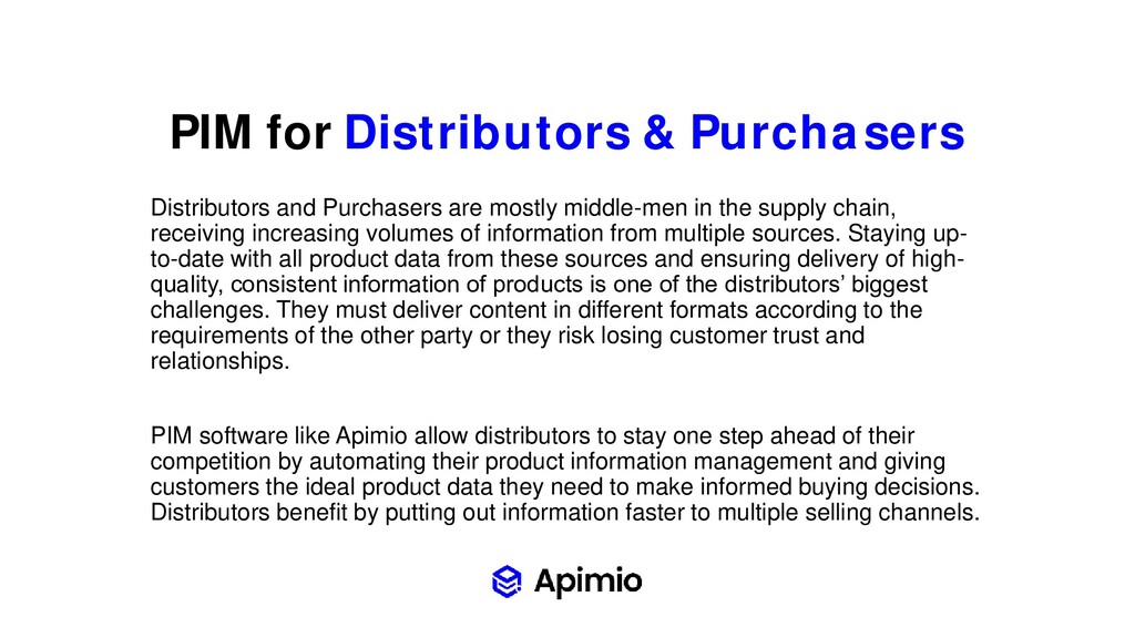 PIM software like Apimio allow distributors to stay one step ahead of their competition by automating their product information management and giving customers the ideal product data they need to make informed buying decisions. Distributors benefit by putting out information faster to multiple selling channels.