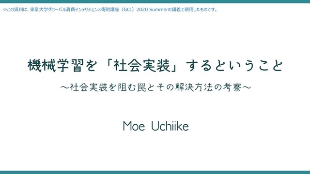 した場合の経済的損失やフードロスは︖ • その責任は⼀体誰が取るのか︖ • そもそもこの期間にモデルを稼働させるのか︖ 我々が⽴ち向かわなければならないのは、まさにこのような問題の数々︕ Copyright © Moe Uchiike All Rights Reserved. • 仮に稼働させるとして、予測値は 「後処理」 するべきではないか︖ • その 「後処理」 は何が適切か︖ルールベースなのか︖ • ローンチを遅らせてみるのはどうか︖ • ローンチを遅らせたとして、パンデミックの期間のデータはモデルに学習 させていいのか︖ いかがでしたでしょうか。この問題に明確な答えがあるわけではありません。 ですが、ありとあらゆることを考えなければならないことがわかります。 この事実に気づくことが機械学習の 「社会実装」 に直結します。
