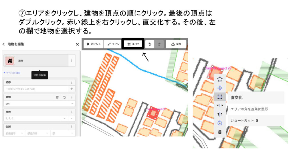 ⑦エリアをクリックし、建物を頂点の順にクリック。最後の頂点は ダブルクリック。赤い線上を右クリックし、直交化する。その後、左 の欄で地物を選択する。 ↑