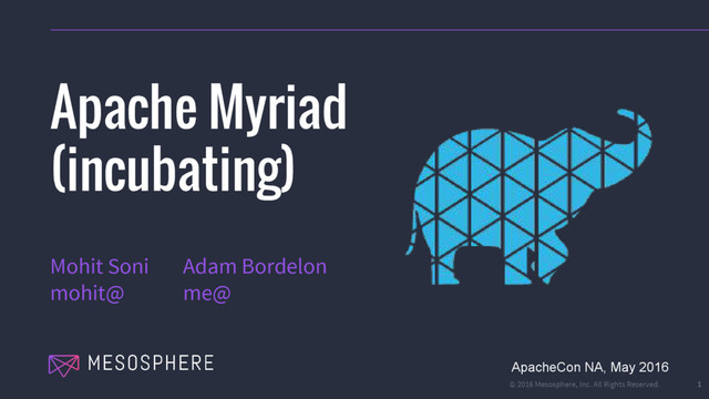 LOVES MYRIAD • Elastic scaling: NM count and capacity • Fault-tolerant: Maintain RM/NM capacity • Cluster utilization: colocated services, shared resources • Isolation: Cpu, memory, disk, network, gpus, etc. • Multitenancy: many Hadoop clusters on one Mesos cluster • Portable: Works with any modern Hadoop2 distro