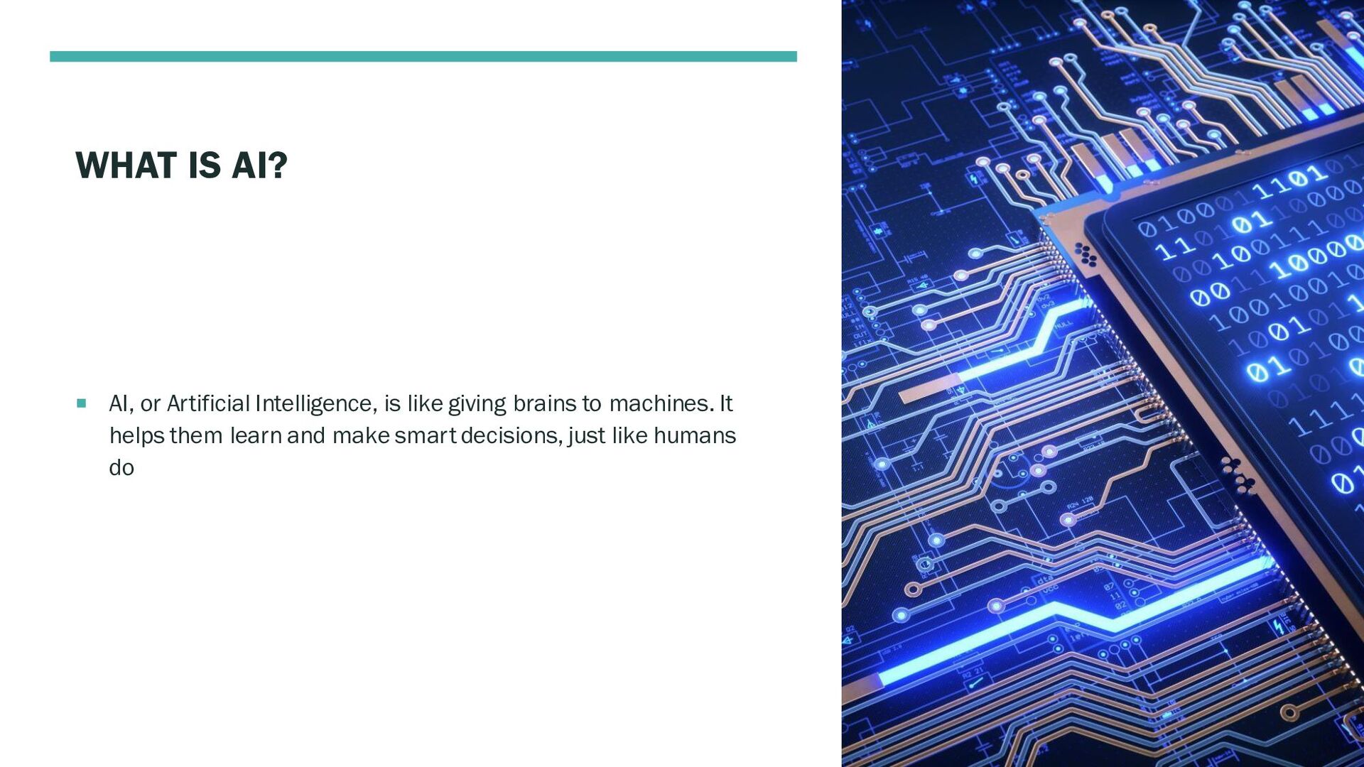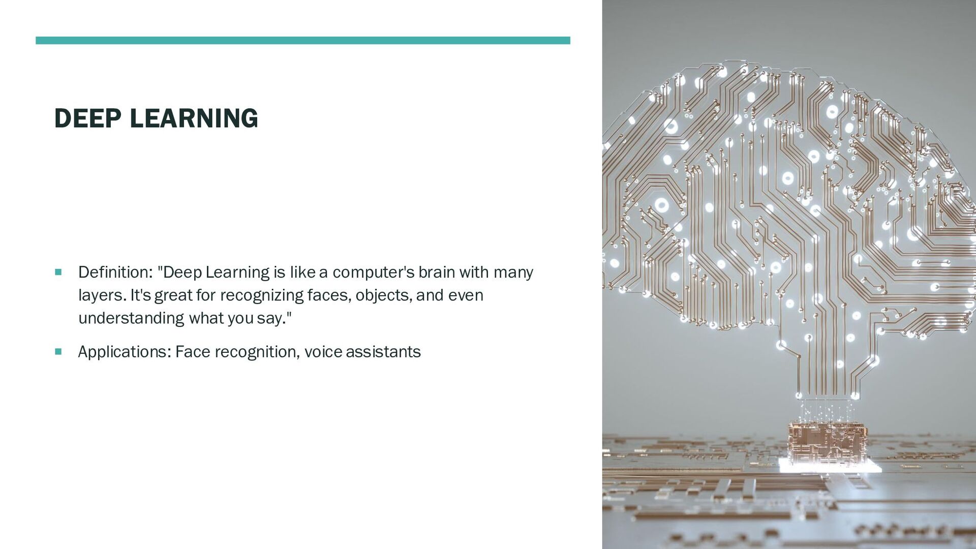 brain with many layers. It's great for recognizing faces, objects, and even understanding what you say." Applications: Face recognition, voice assistants