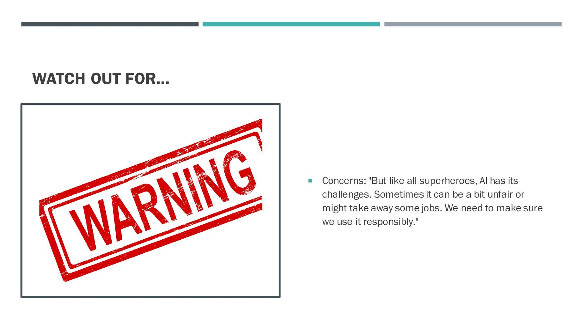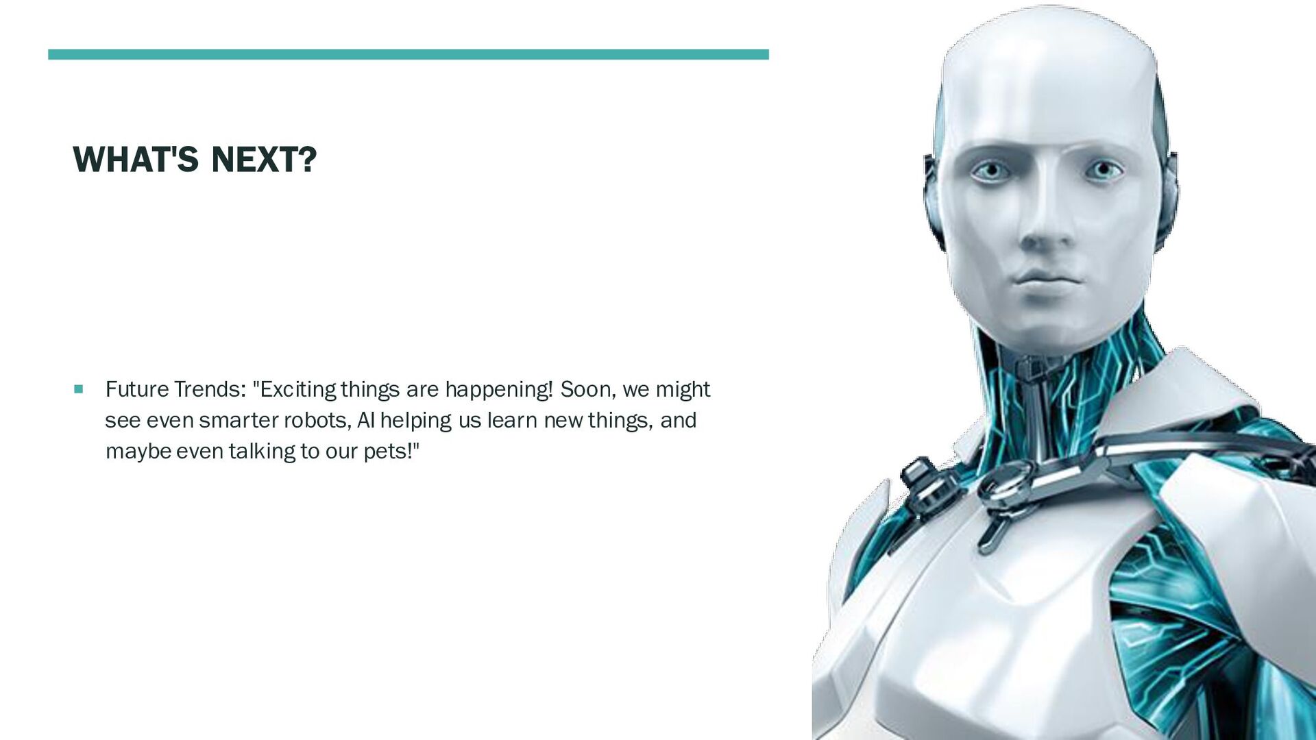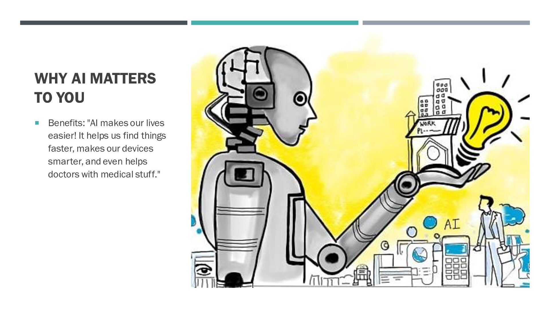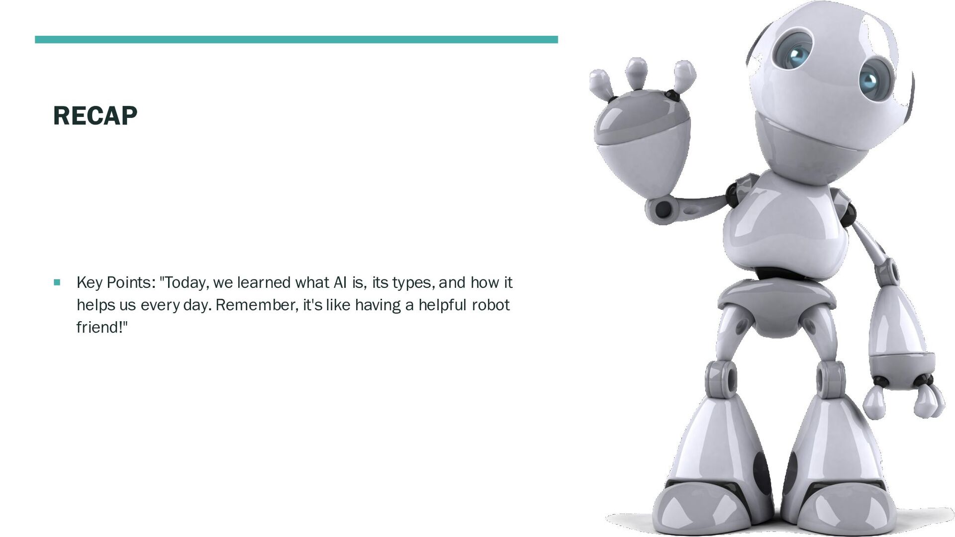 computer to do tricks. It learns from examples and gets better over time." Types: Supervised Learning (teaching with examples), Unsupervised Learning (learning by exploring), Reinforcement Learning (learning by doing)