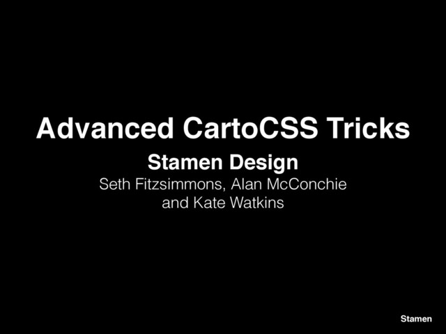 CartoCSS is becoming an ever more popular – and ever more powerful – tool for cartographic and data styling. In this talk, Stamen designers and technologists will present some tips and tricks to make your next design sing. Tips and tricks covered include, but will not be limited to: pixelation, use of dingbat fonts for texture and markers, post-facto label adjustment, alternate uses for text symbolization, where to find and use entropy, blending, and geometry manipulation.