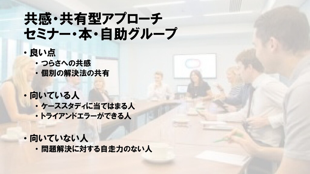 共感・共有型アプローチ セミナー・本・自助グループ • 良い点 • つらさへの共感 • 個別の解決法の共有 • 向いている人