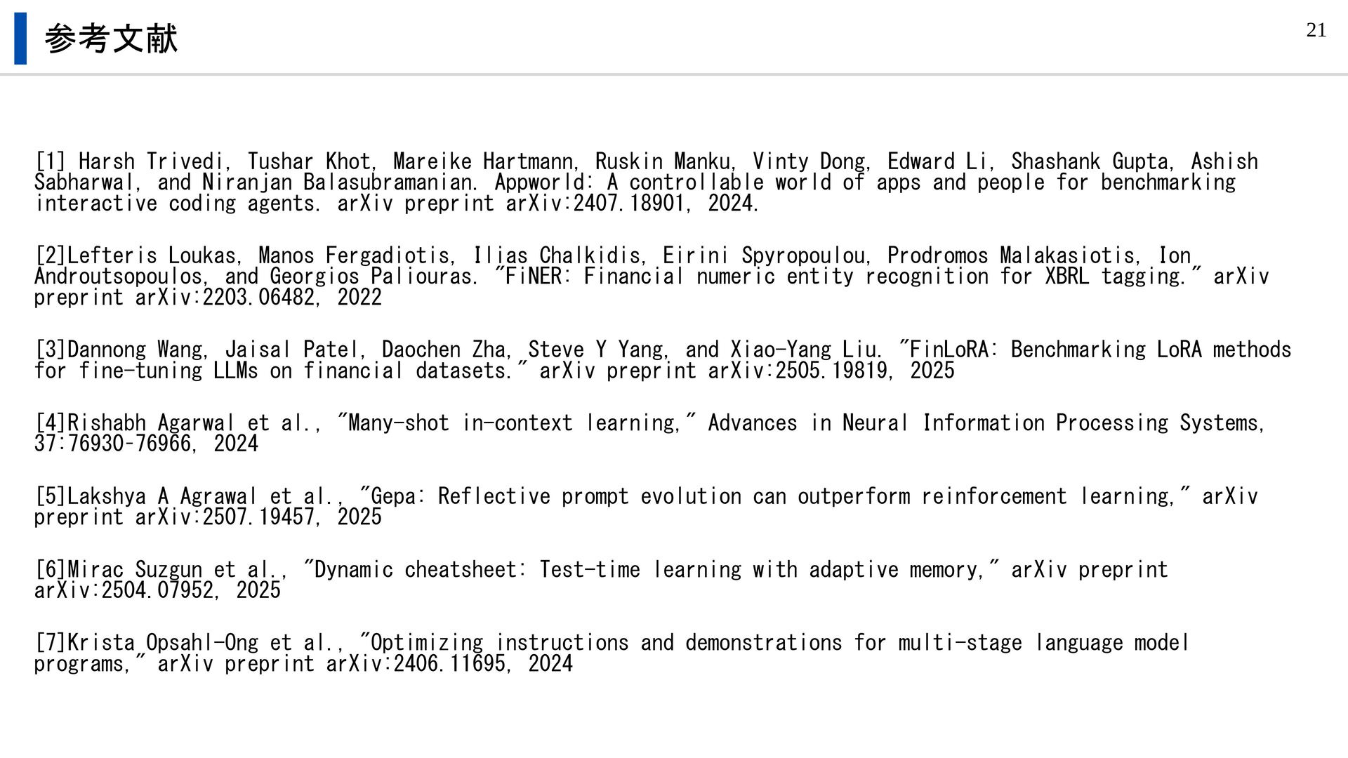 Manku, Vinty Dong, Edward Li, Shashank Gupta, Ashish Sabharwal, and Niranjan Balasubramanian. Appworld: A controllable world of apps and people for benchmarking interactive coding agents. arXiv preprint arXiv:2407.18901, 2024. [2]Lefteris Loukas, Manos Fergadiotis, Ilias Chalkidis, Eirini Spyropoulou, Prodromos Malakasiotis, Ion Androutsopoulos, and Georgios Paliouras. "FiNER: Financial numeric entity recognition for XBRL tagging." arXiv preprint arXiv:2203.06482, 2022 [3]Dannong Wang, Jaisal Patel, Daochen Zha, Steve Y Yang, and Xiao-Yang Liu. "FinLoRA: Benchmarking LoRA methods for fine-tuning LLMs on financial datasets." arXiv preprint arXiv:2505.19819, 2025 [4]Rishabh Agarwal et al., "Many-shot in-context learning," Advances in Neural Information Processing Systems, 37:76930–76966, 2024 [5]Lakshya A Agrawal et al., "Gepa: Reflective prompt evolution can outperform reinforcement learning," arXiv preprint arXiv:2507.19457, 2025 [6]Mirac Suzgun et al., "Dynamic cheatsheet: Test-time learning with adaptive memory," arXiv preprint arXiv:2504.07952, 2025 [7]Krista Opsahl-Ong et al., "Optimizing instructions and demonstrations for multi-stage language model programs," arXiv preprint arXiv:2406.11695, 2024