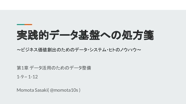 実践的データ基盤への処方箋 〜ビジネス価値創出のためのデータ・システム・ヒトのノウハウ〜 第1章 データ活用のためのデータ整備 1-9 ~ 1-12 Momota Sasaki( @momota10s
