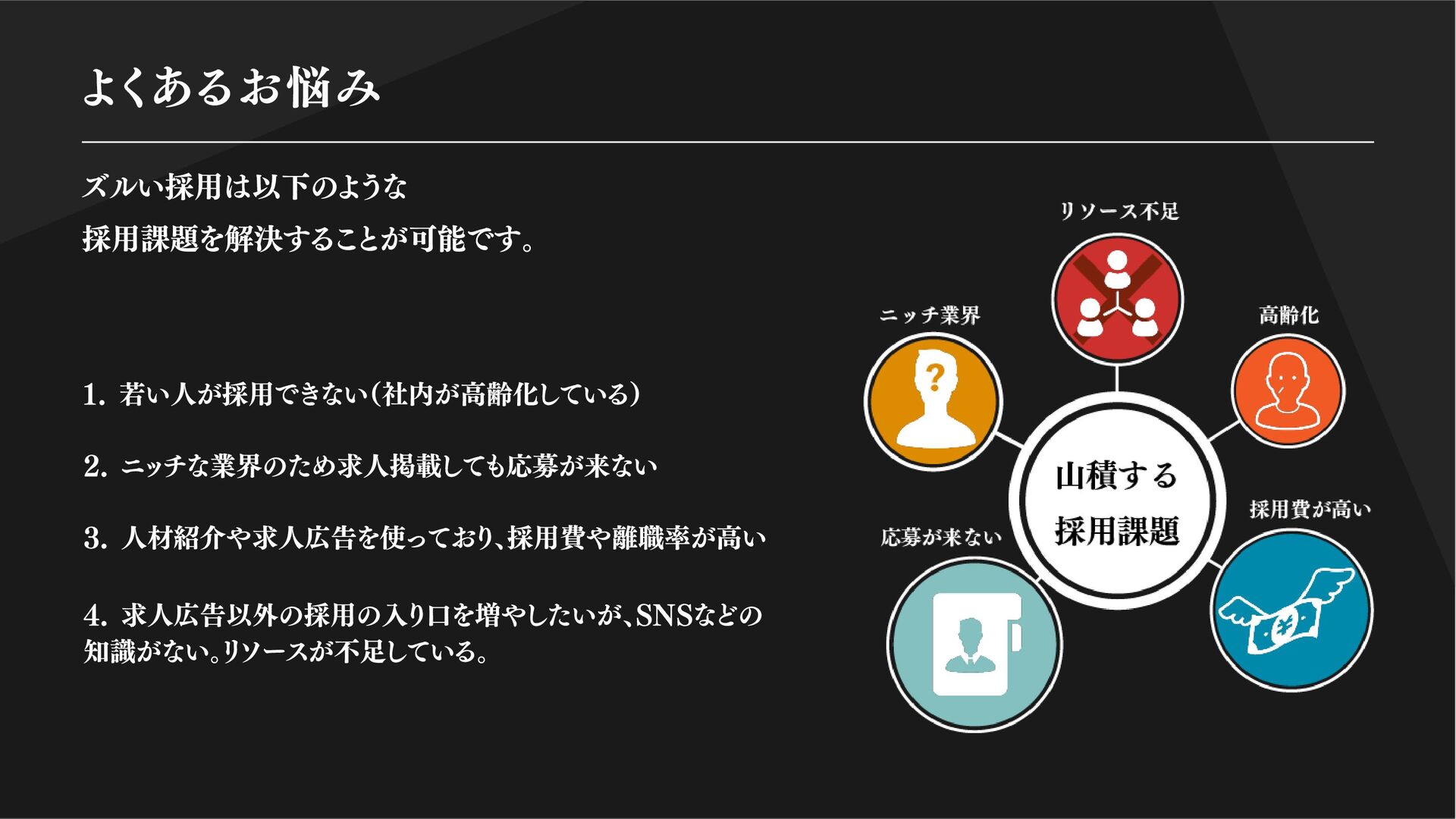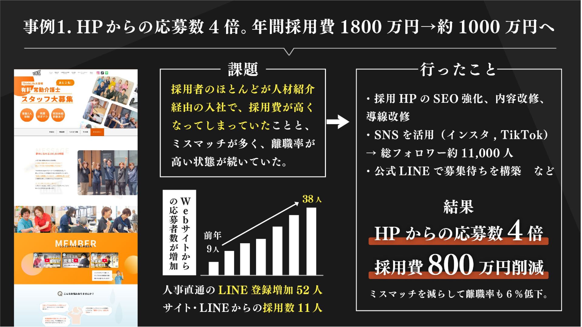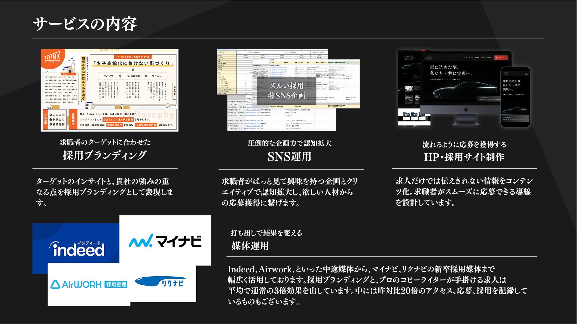 ツ化。求職者がスムーズに応募できる導線 を設計しています。 Indeed、Airwork、といった中途媒体から、マイナビ、リクナビの新卒採用媒体まで 幅広く活用しております。採用ブランディングと、プロのコピーライターが手掛ける求人は 平均で通常の3倍効果を出しています。中には昨対比20倍のアクセス、応募、採用を記録して いるものもございます。 採用ブランディング 求職者のターゲットに合わせた SNS運用 圧倒的な企画力で認知拡大 HP・採用サイト制作 流れるように応募を獲得する 媒体運用 打ち出しで結果を変える