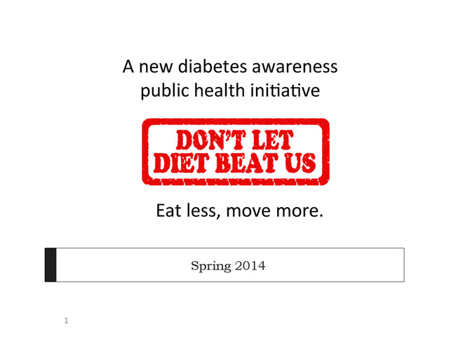 can prevent or delay Type 2 diabetes with diet and exercise changes. Don`t let diet beat us. } Studies show that people can slow down, stop or in some cases reverse their pre-‐diabe3c symptoms via lifestyle changes } Goal: Communicate that you can leat this to prevent that.z Good food is good medicine. Eat less and move more to prevent Type 2 diabetes. } Target: 79 million Americans at risk of developing Type 2 diabetes. 12