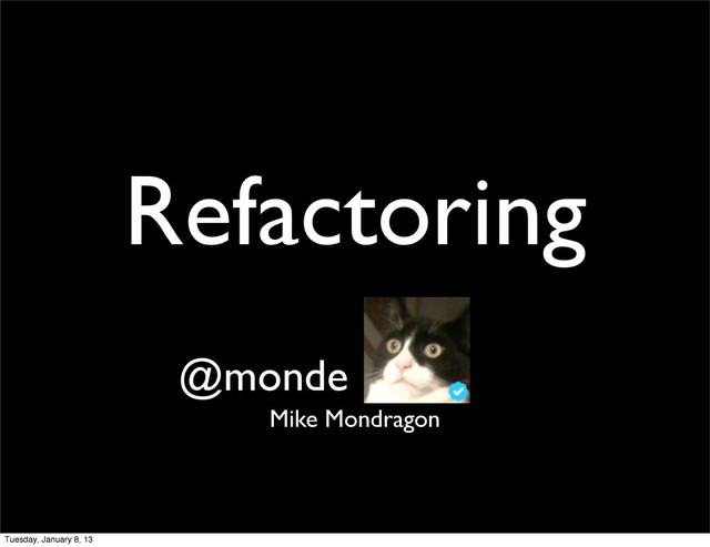 Seattle.rb shirt by veganstraightedge http://www.flickr.com/photos/veganstraightedge/7843002706/in/set-72157631203475428 Amazon cover of “Refactoring” book http://www.amazon.com/Refactoring-Improving-Design-Existing-Code/dp/0201485672 Wallace the cat cradled like a baby - Mike Mondragon Xzibit head shot - The Internet Wallace - THE INTERNETS is watching - Mike Mondragon on icanhazcheezburger Green field @ wallpaperstock.net http://wallpaperstock.net/green-field_wallpapers_8739_1024x768_1.html Palouse wheat field - unknown Palouse wheat field - unknown Tilled field - unknown CapGun logo - Mike Mondragon Skitch screen cap of CapGun panel - Mike Mondragon Tilled field - unknown Kitten asleep in food dish http://catlovingcare.com/2042/blog/loosing-weight-tips-for-fat-cats/2009/12/ Skitch screen cap of http://tublr.capgun.io/ - Mike Mondragon CapGun.io result for Seattlerb.org - Mike Mondragon Wallace the cat profile - Mike Mondragon Tuesday, January 8, 13