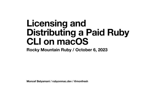 A talk I gave at Rocky Mountain Ruby in Boulder, Colorado on October 6, 2023. I took the audience through my journey figuring out how to enforce licenses and limitations for my Ruby on Mac product, and how to generate a self-contained Ruby binary.