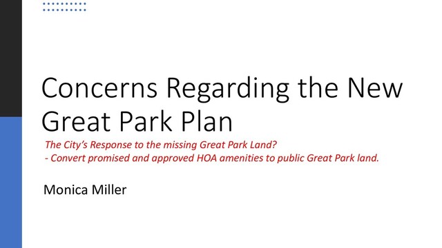 Why is the city of Mesa converting approved and zoned, private HOA amenities for the residents of Eastmark to public Great Park land without a public hearing? I have enclosed my summary of concerns regarding the new Great Park plan .