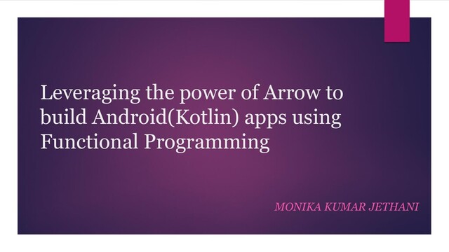 This presentation introduces the viewers to Functional Programming, concept of Pure function, Functional Programming Language, Functional Constructs of Kotlin, Limitations of Kotlin, Introduction to Arrow, Deep-dive into Arrow's data types-Option, Either, Try[with examples and use cases], Deep-dive into Arrow's Type classes - Functor, Applicative, Monad[with examples and how they work], Relation between Functor, Applicative and Monad, More FP concepts- Function composition, Piping, Logical complement, Memoization, Integration of Arrow with Android Studio project, Sample Arrow apps and Best practices when trying to build with Arrow.