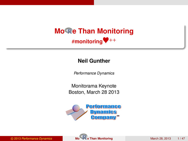 Correlation Radar Alp12Mn AvrROE DivToP GrowAPS GrowAsst GrowBPS GrowCFPS GrowDPS GrowEPS GrowSPS HistAlp HistSigm InvVsSal LevGrow Payout5 PredSigm RecVsSal Ret12Mn Ret3Mn Ret1Mn ROE _CshPlow _DDM _EarnMom _EstChgs _EstRvMd _Neglect _NrmEToP _PredEToP _RelStMd _ResRev _SectMom AssetToP ARM_Pref_Earnings AvrCFtoP AvrDtoP AvrEtoP ARM_Sec_Earnings BondSens BookToP Capt CaptAdj CashToP CshFlToP CurrSen DivCuts5 EarnToP Earnvar Earnyld Growth HistBeta IndConc Leveflag Leverag Leverage Lncap Momentum Payoflag PredBeta Ret_11M_Momentum PotDilu Price ProjEgro RecEPSGr SalesToP Size SizeNonl Tradactv TradVol Value VarDPS Volatility Yield CFROI ADJUST ERC RC SPX R1000 MarketCap TotalRisk Value_AX truncate_ret_1mo truncate_PredSigma Residual_Returns ARM_Revenue ARM_Rec_Comp ARM_Revisions_Comp ARM_Global_Rank ARM_Score TEMP EQ_Raw EQ_Region_Rank EQ_Acc_Comp EQ_CF_Comp EQ_Oper_Eff_Comp EQ_Exc_Comp -0.5 0 0.5 1 Example (using R) require(plotrix) corelations <- c(1:97) corelation.names <- names(corelations) <- c("Alp12Mn", "AvrROE", "DivToP", "GrowAPS", "GrowAsst", "GrowBPS", "GrowCFPS", ... corelations <- c(0.223, 0.1884, -0.131, 0.1287, 0.0307, ... par(ps=6) radial.plot(corelations, labels=corelation.names,rp.type="p", main="Correlation Radar", radial.lim=c(-1,1),line.col="blue") c 2013 Performance Dynamics Mo e Than Monitoring March 28, 2013 38 / 47