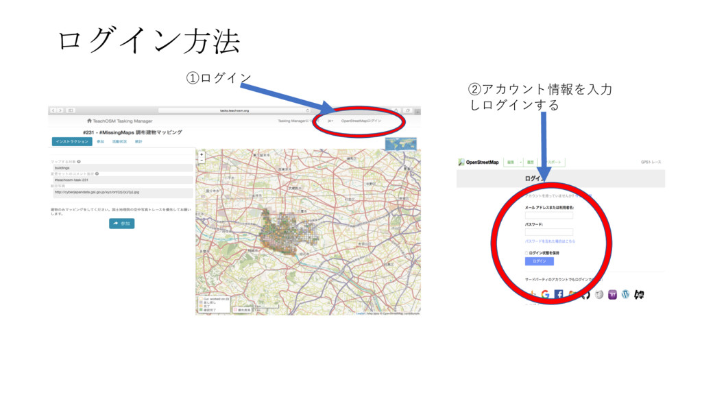 ログイン方法 ①ログイン ②アカウント情報を⼊⼒ しログインする