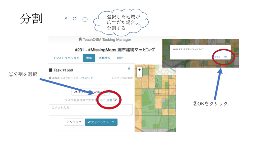 分割 ①分割を選択 ②OKをクリック 選択した地域が 広すぎた場合、 分割する