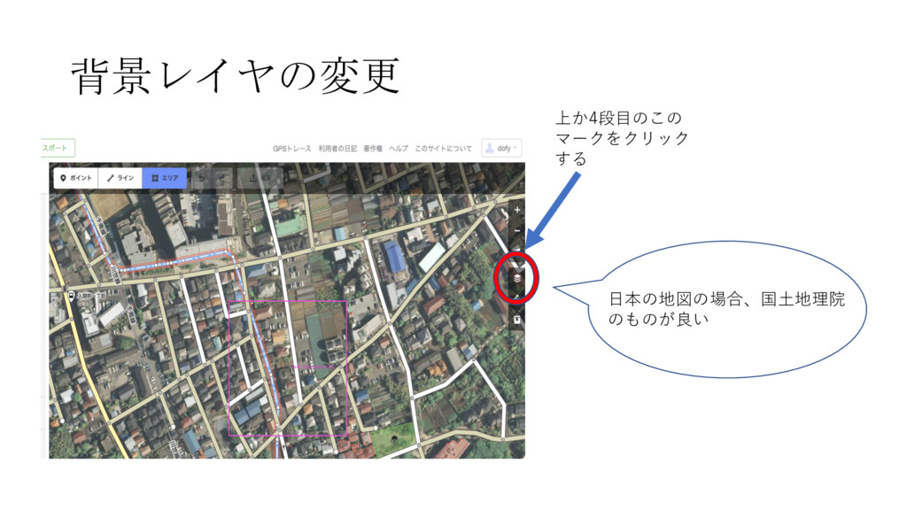 背景レイヤの変更 上か4段⽬のこの マークをクリック する ⽇本の地図の場合、国⼟地理院 のものが良い