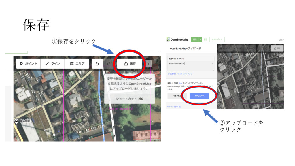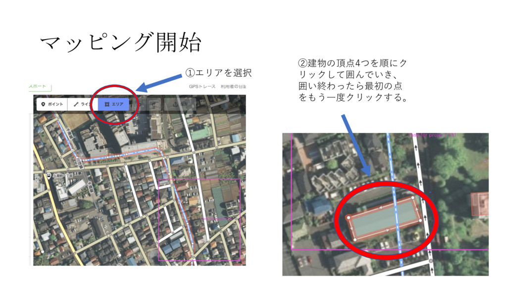 マッピング開始 ①エリアを選択 ②建物の頂点4つを順にク リックして囲んでいき、 囲い終わったら最初の点 をもう⼀度クリックする。