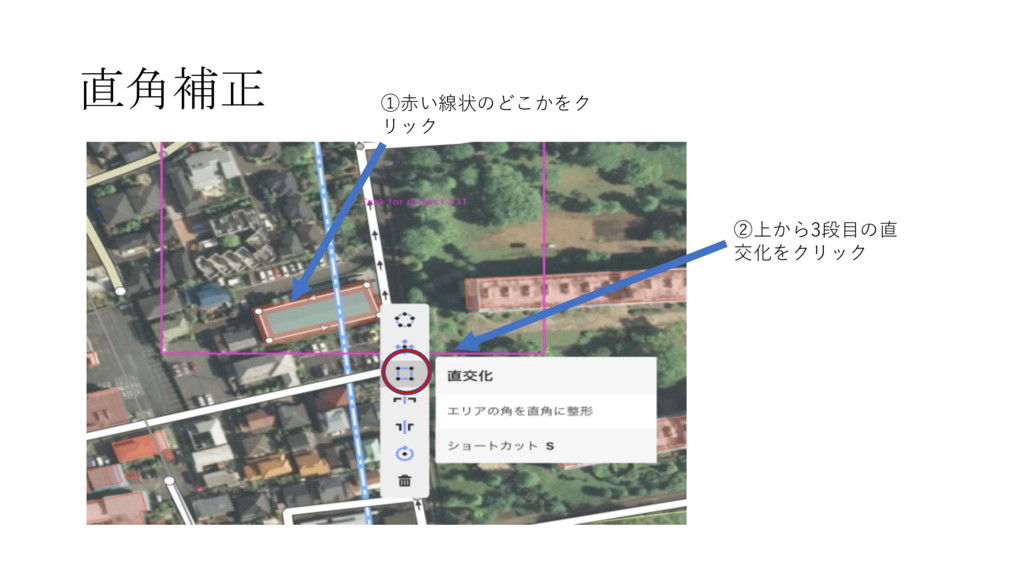 直角補正 ①⾚い線状のどこかをク リック ②上から3段⽬の直 交化をクリック