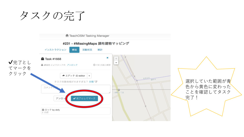 タスクの完了 ✔完了とし てマークを クリック 選択していた範囲が⻘ ⾊から⻩⾊に変わった ことを確認してタスク 完了!