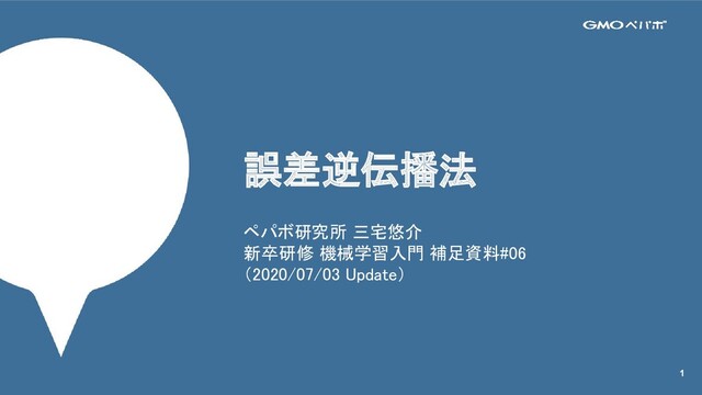 1 ペパボ研究所 三宅悠介 新卒研修 機械学習入門 補足資料#06 (2020/07/03 Update) 誤差逆伝播法